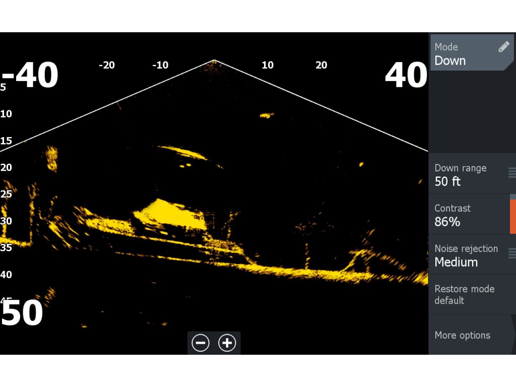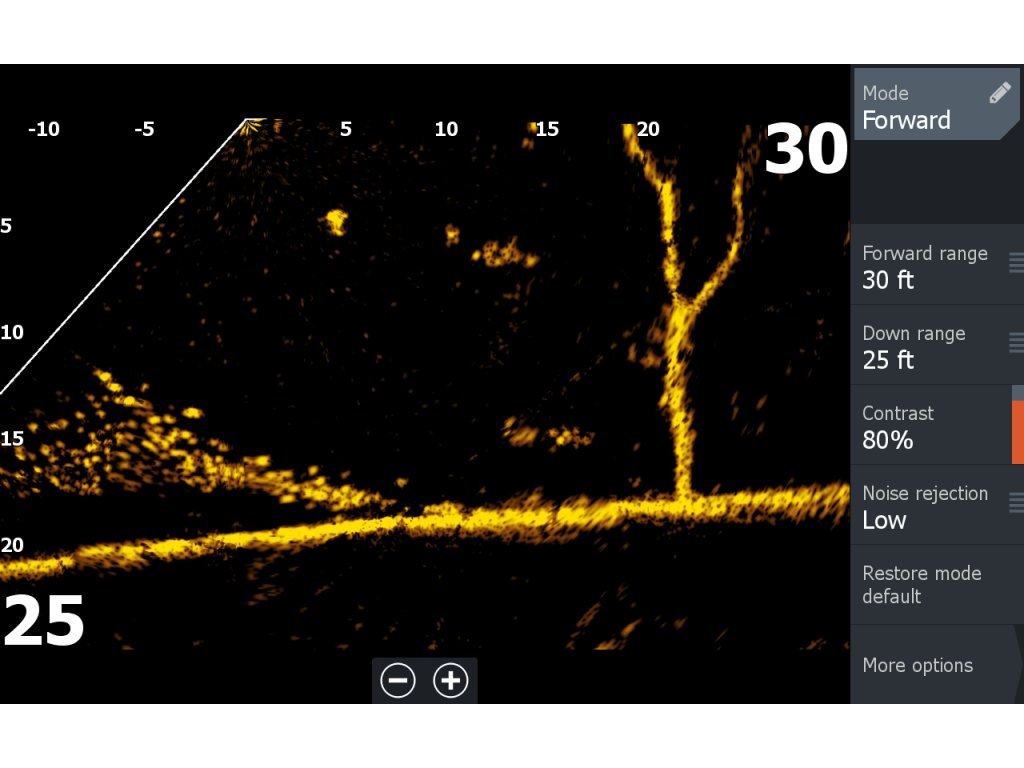 Zobrazuje struktury a rybí cíle, které se nacházejí před sondou.