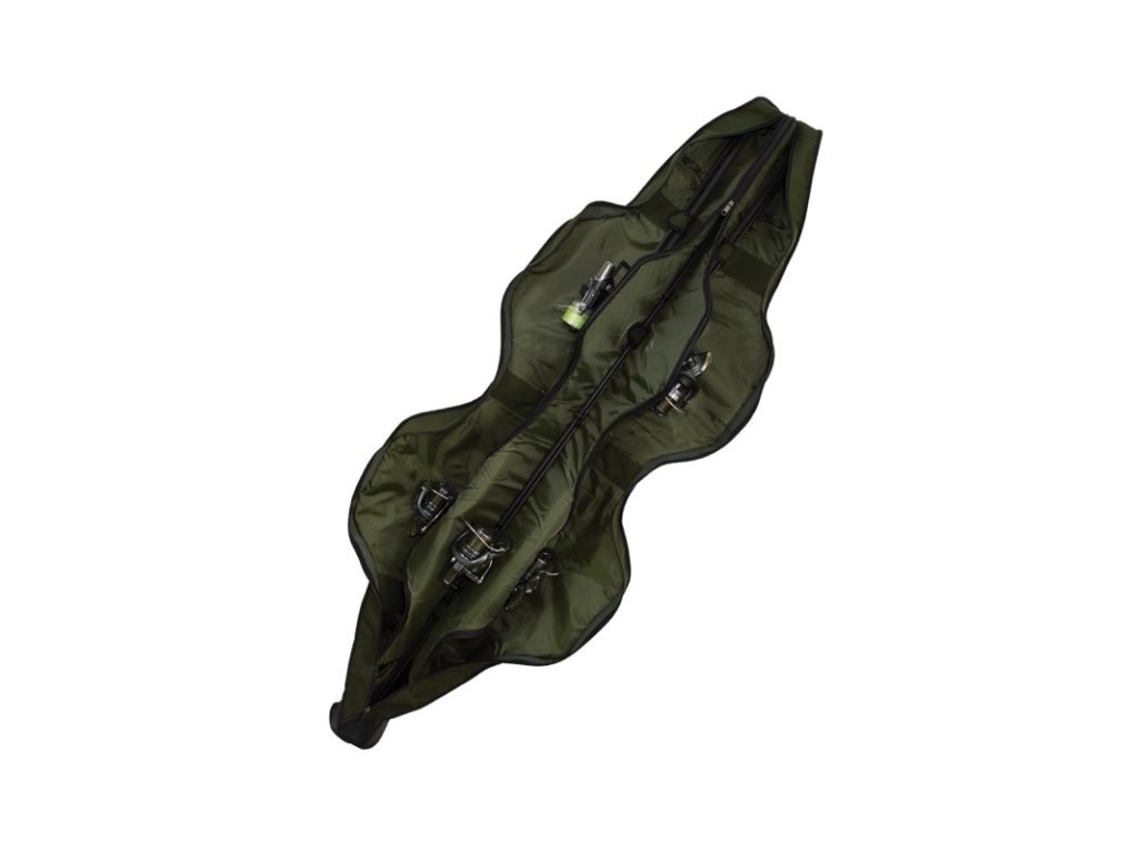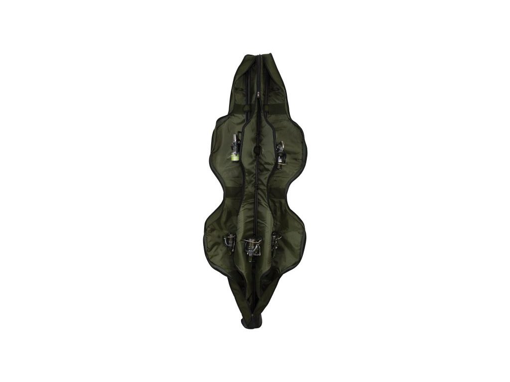 Uvnitř se nachází vypolstrované přepážky mezi pruty. Při umístění tří prutů směrem nahoru a dvou prutů obráceně se do obalu skutečně spolehlivě vejde pět 12ft prutů s velkokapacitními navijáky. Na vnější straně se nachází kapsa na podběrák a vidličky. Dále se na obalu samozřejmě nachází rukojeti a ramenní popruh, díky čemuž se vám pruty snadno ponesou.