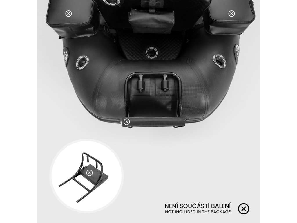 Součástí bellyboatu je přepravní taška, nafukovací pumpa, lepící sada