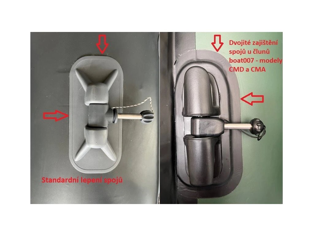 Nafukovací člun boat007 CMA 420, tloušťka PVC materiál 1100g/m2. Jedná se o Korejský materiál, na který poskytujeme 5 let záruku, se zvýšenou odolností proti oděru či mechanickému poškození. Tyto modely mají tepelně svařované spoje (spoj tubusů je naprosto bez lepidla, takže lepidlo nestárne když tam není), na spoje a dvojitě lepené držáky poskytujeme záruku 3 roky, navíc spoj je tvořen ze 4 vrstvev materiálu viz obrázek.