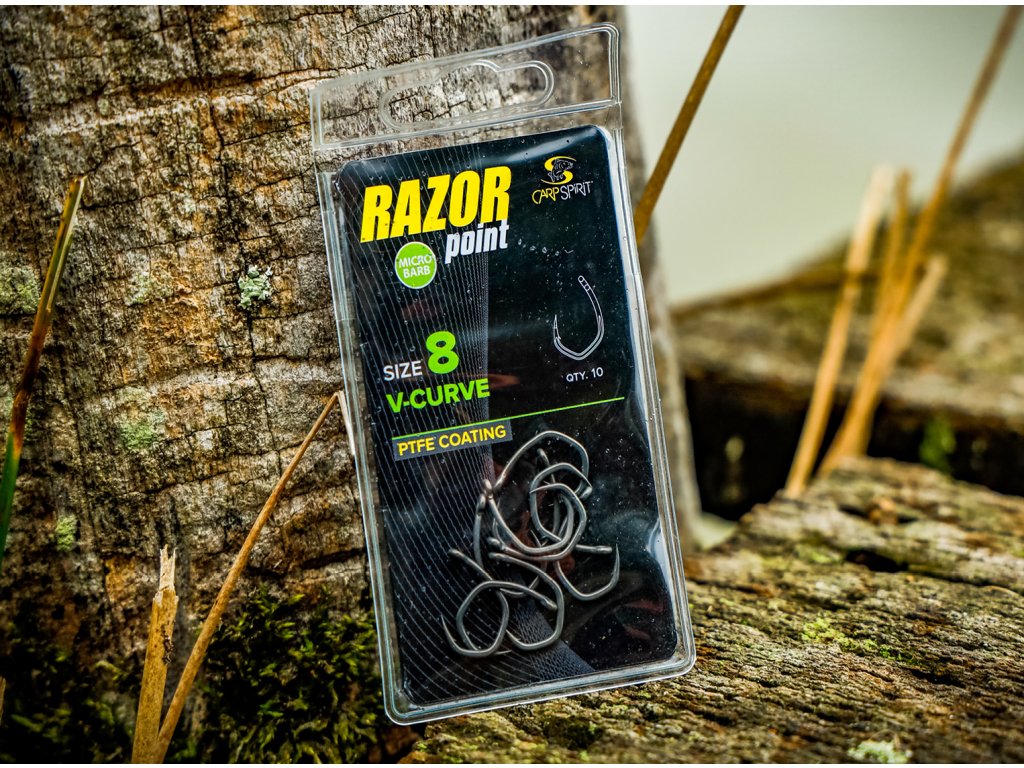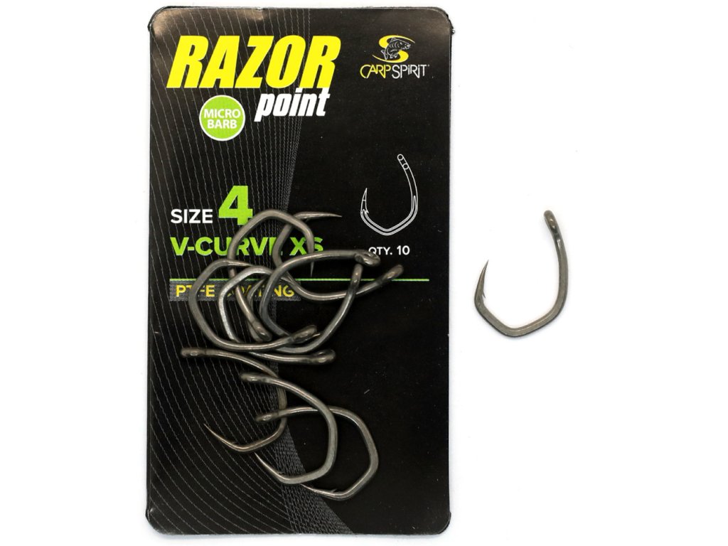 Háčky V-Curve jsou ihned rozeznatelné díky zřetelnému tvaru písmene 'V' v oblouku. Háčky V-Curve, jsou výbornou volbou pro lov velkých trofejních kaprů nebo rybaření v náročném terénu s překážkami. Zvláštní tvar výrazně redukuje pohyb háčku, protože veškerá tažná síla je soustředěna do středu oblouku. Proto také výrazně klesá pravděpodobnost jeho uvolnění v průběhu zdolávání ryby. Mimořádně široce otevřený oblouk, krátké raménko a dovnitř zahnutý háček výrazně zvyšují účinnost a zlepšují průnik. Háček s mikroprotihrotem je vyroben z uhlíkové oceli nejvyšší kvality a má matný teflonový povrch (PTFE).