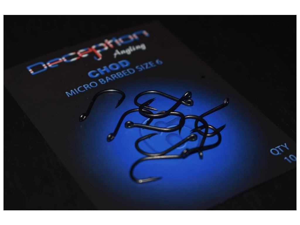 Standardní Chod háček od Deception Angling je navržen tak, aby měl 5° vytočené oko, což mu umožňuje sedět v agresivnějším úhlu. To usnadňuje jeho použití a zajišťuje efektivní prezentaci nástrah. Oko je dostatečně velké, aby procházelo pevnou šňůrou třikrát, což je ideální pro D-rig prezentace. Tento háček je také skvěle vhodný pro použití na Multi rig.
