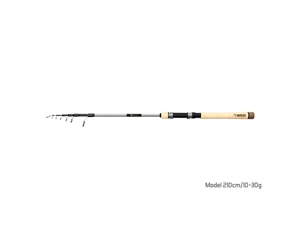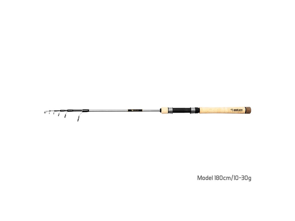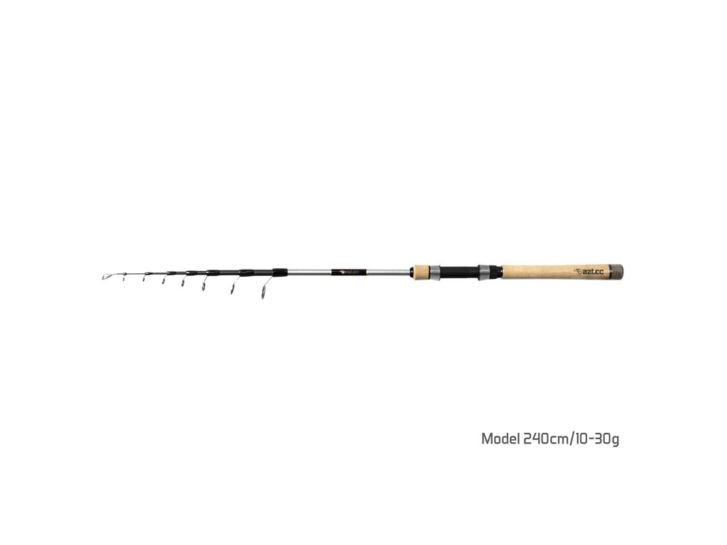 Teleskopický prut už dávno neznamená automaticky nižší kvalitu. To dokazuje řada teleskopů AZTEC, která v sobě snoubí kompaktní rozměry při zachované kvalitě komponentů. Využili jsme kvalitní 24T karbon, na kterém je celý prut postaven, použili velmi dobrá očka, pěkný a odolný korek. Kompletní prut tak splňuje všechny kvalitativní požadavky děleného prutu při zachování excelentních kompaktních rozměrů. Černý matný blank kontrastně doplňuje jeho stříbrná část nad rukojetí s menší černou částí s logem. To je laserem vypálené i na korkové rukojeti, která je ukončena krátkou částí vyhotovenou z hustého, tzv. RUBBER CORK-u, která tak chrání spodní část. Pokud jste fanouškem staré školy, nebo požadujete minimalistickou výbavu, sáhněte po extrémně univerzálním prutu AZTEC TELE. Jelikož se teleskopický prut skládá z více dílů a spojů, může být tímto celková délka prutu ovlivněna +/-3% oproti udávané. Technické parametry: Model: 180cm / 10-30g Počet dílů: 6 Počet oček: 6 Transportní délka: 50cm Hmotnost: 123g Rukojeť: korek Délka rukojeti (od spodní části prutu po střed sedla): 26cm Model: 210cm / 10-30g Počet dílů: 7 Počet oček: 6 Transportní délka: 51cm Hmotnost: 134g Rukojeť: korek Délka rukojeti (od spodní části prutu po střed sedla): 26cm Model: 240cm / 10-30g Počet dílů: 7 Počet oček: 8 Transportní délka: 52cm Hmotnost: 139g Rukojeť: korek Délka rukojeti (od spodní části prutu po střed sedla): 26cmDoplňkové parametry