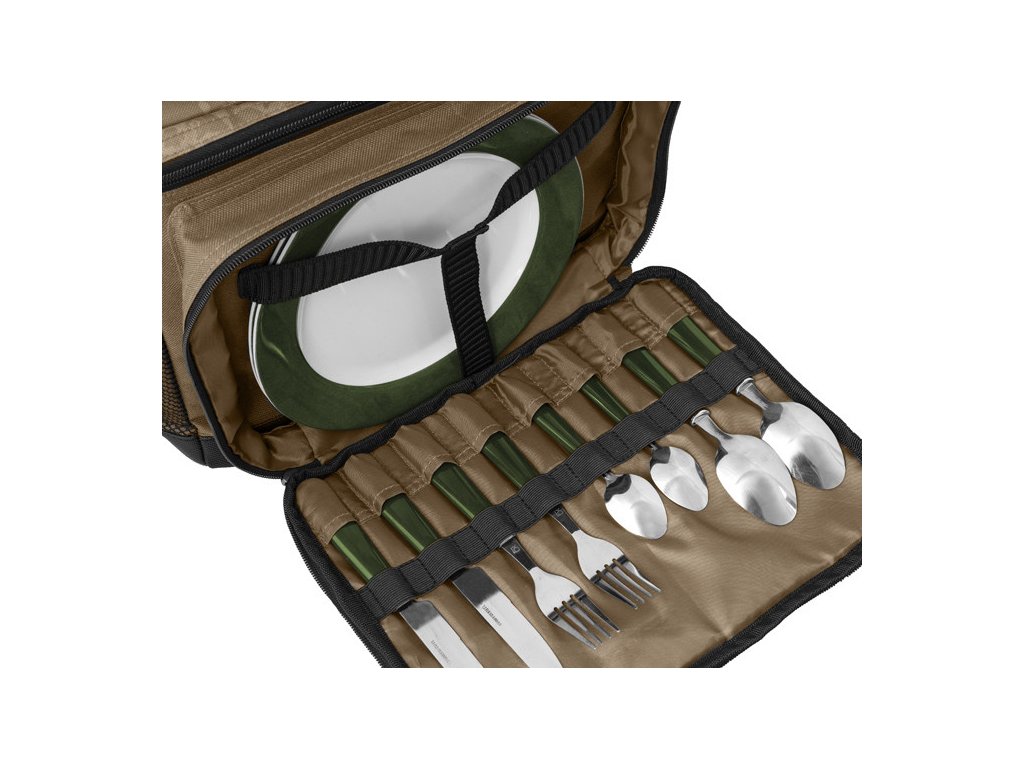 V přední části je velká kapsa, ve které je umístěna kompletní jídelní sada pro dvě osoby. Obsahuje dva kusy plastových talířů, dva nože, dvě vidličky, dvě lžíce a dvě malé dezertní lžičky. Odteď si můžete dopřát více komfortu, i když jste u vody se svou polovičkou nebo parťákem!