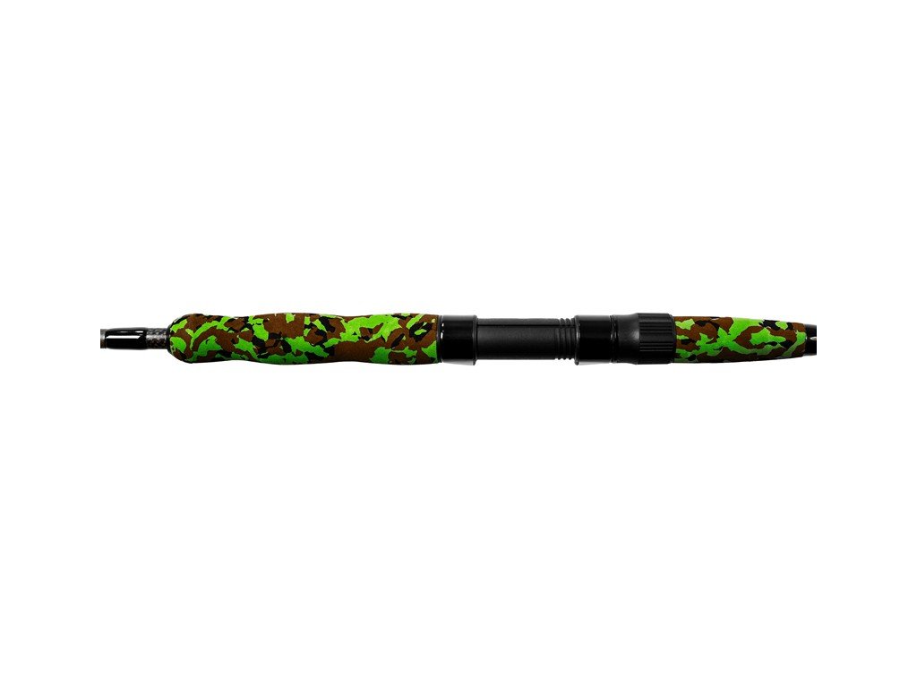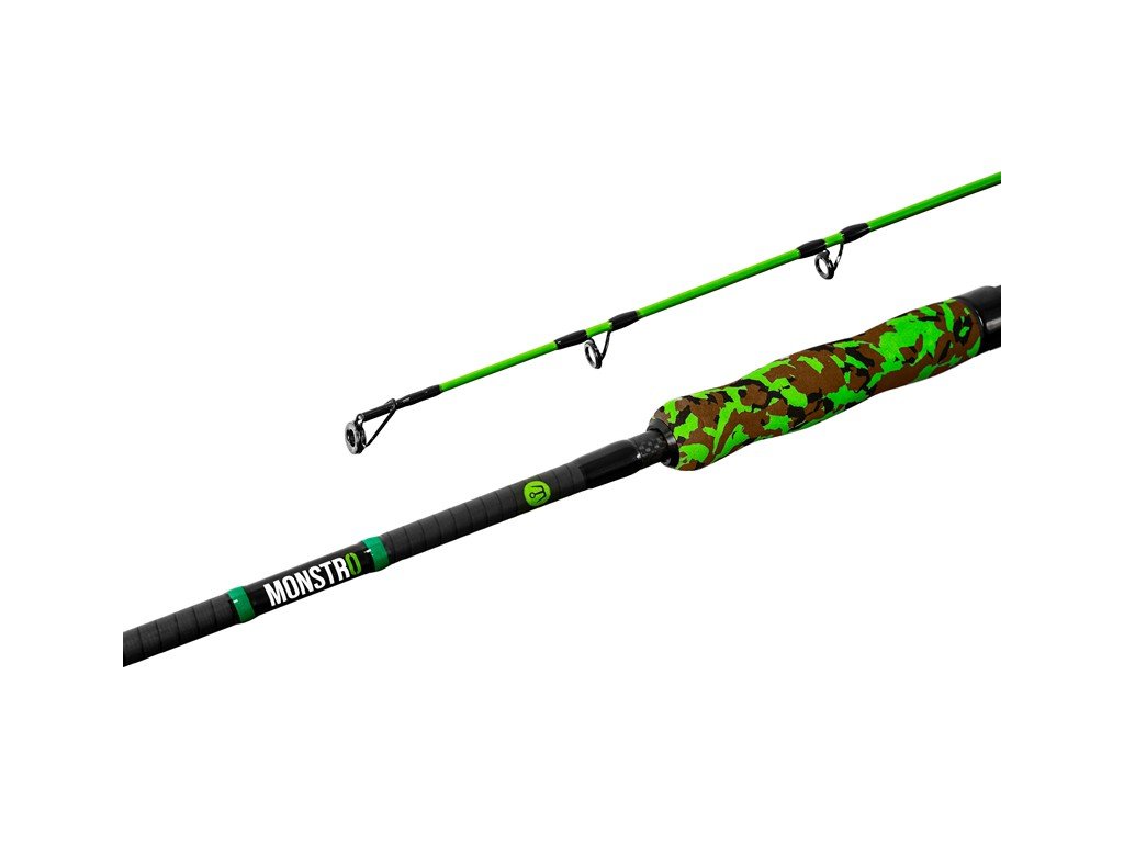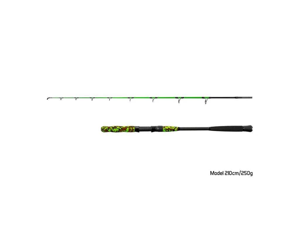 Nová generace prutu MONSTRO je zaměřena na aktivní lov sumců na vábničku nebo vertikální přívlač. MONSTRO vás na první pohled zaujme novým, propracovaným a agresivnějším designem. Prut si prošel přepracováním a vyztužením blanku. Gramáž poskočila na úctyhodných 250g a díky technickým řešením přináší rovnoměrné rozdělení síly při zdolávání, bez zbytečných spojů. Primárně je určen pro extrémní lov zejména z člunu nejen na řekách nebo jezerech, ale dokonce zvládá i lov z člunu na moři. Rukojeť má nový ergonomický design, který oceníte v extrémních situacích a její koncovka je vhodná pro použití se zdolávací pásem. Zdoláte s ním i ty největší ryby z hlubin. Obrovské sumce či velké mořské ryby. To jsou cíle tohoto krátkého, avšak extrémně silného prutu. Už při navrhování jsme dbali na výjimečně silný blank, který zkrotí i ty největší krále vod. Sedlo navijáku je navíc pojištěno ještě maticí, což zaručuje, že ani v těch nejkrizovějších momentech Monstro nepoleví. Dělení prutu je asymetrické - blank (150cm), včetně všech oček se vkládá do rukojeti (70cm), protože pouze tak je možné garantovat opravdovou sílu neoslabenou klasickou spojkou. Už při navrhování jsme dbali na výjimečně silný blank se zpevňujícím karbonovým opletem PowerWrap, který je velmi pevný a výborně pracuje při nahazování či zdolávání. Očka prutu jsou zesílena a vyvázána s vysokým důrazem na celkovou odolnost a vysoké namáhání. Technické parametry: Model: 210cm / 200g Počet dílů: 2 Průměr blanku nad rukojetí: 11mm Počet oček: 9 Transportní délka: 150cm Hmotnost: 300g Rukojeť: Pogumovaná, vzor XXX Délka rukojeti (od spodní části prutu po střed sedla): 65cm Model: 210cm / 250g Počet dílů: 2 Průměr blanku nad rukojetí: 11,26mm Počet oček: 9 Transportní délka: 150cm Hmotnost: 329g Rukojeť: dělená, EVA pěna Délka rukojeti (od spodní části prutu po střed sedla): 51cmDoplňkové parametry