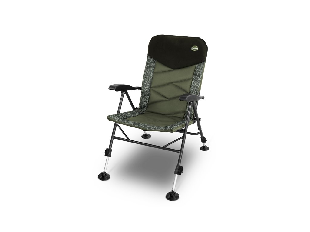 Pokud na rybách rádi trávíte spoustu času, tak mezi nezbytnou výbavu určitě patří i kvalitní, spolehlivé a pohodlné křeslo. Delphin Triumph splňuje všechny tyto parametry, přičemž ta nejdůležitější z nich je právě maximální komfort, ke kterému v tomto případě přispívá vyšší opěradlo s kvalitní, polstrovanou matrací.Nastavitelný mechanismus umístěný v loketních opěrkách křesla umožňuje měnit úhel opěradla v závislosti na potřebách rybáře. O maximální pohodlí hlavy a krční páteře se stará extra polstrovaný fleecový panel tmavě zelené barvy opatřeným logem produktu. Matrace je v zádové a sedací části tvořena odolnou 600D látkou s jedinečným šikmým prošíváním. Po okrajích je umístěna 600D látka s patentovanou C2G kamufláží. Pro příjemnější překlenutí času mezi záběry jsme křeslo vybavili ergonomicky tvarovanými područkami pro dokonalý komfort při relaxování a sledování okolní přírody.