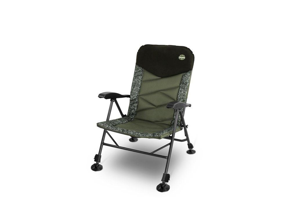 Výškově nastavitelné nohy umožňují přizpůsobit křeslo nerovnoměrnému terénu při lovu v náročných podmínkách. Zajištění polohy křesla zabezpečují také flexibilní robustní patky, jejichž velká plocha zabraňuje zaboření nohou křesla do rozmočeného terénu u vody.