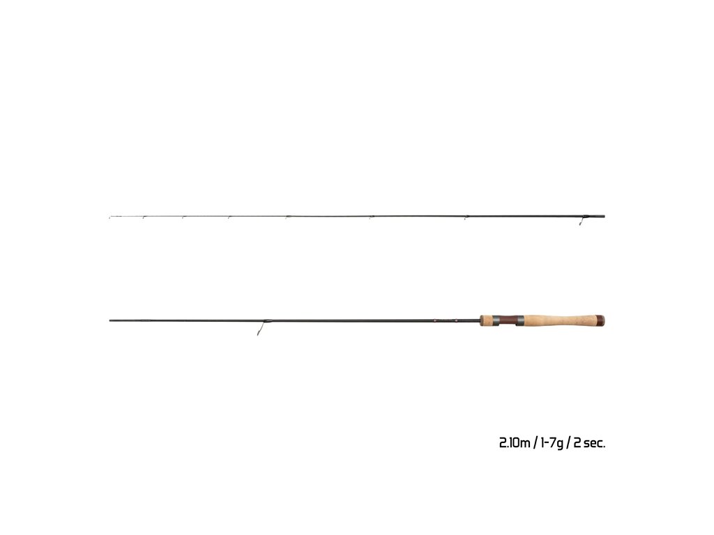 Model: 210cm 1 – 7 g Počet dílů: 2 Průměr blanku nad rukojetí: 8 mm Počet oček: 9 Transportní délka: 109,5 cm Hmotnost: 88 g Rukojeť: korek, imitace dřeva Délka rukojeti (od spodní části prutu po střed sedla): 21,5 cm