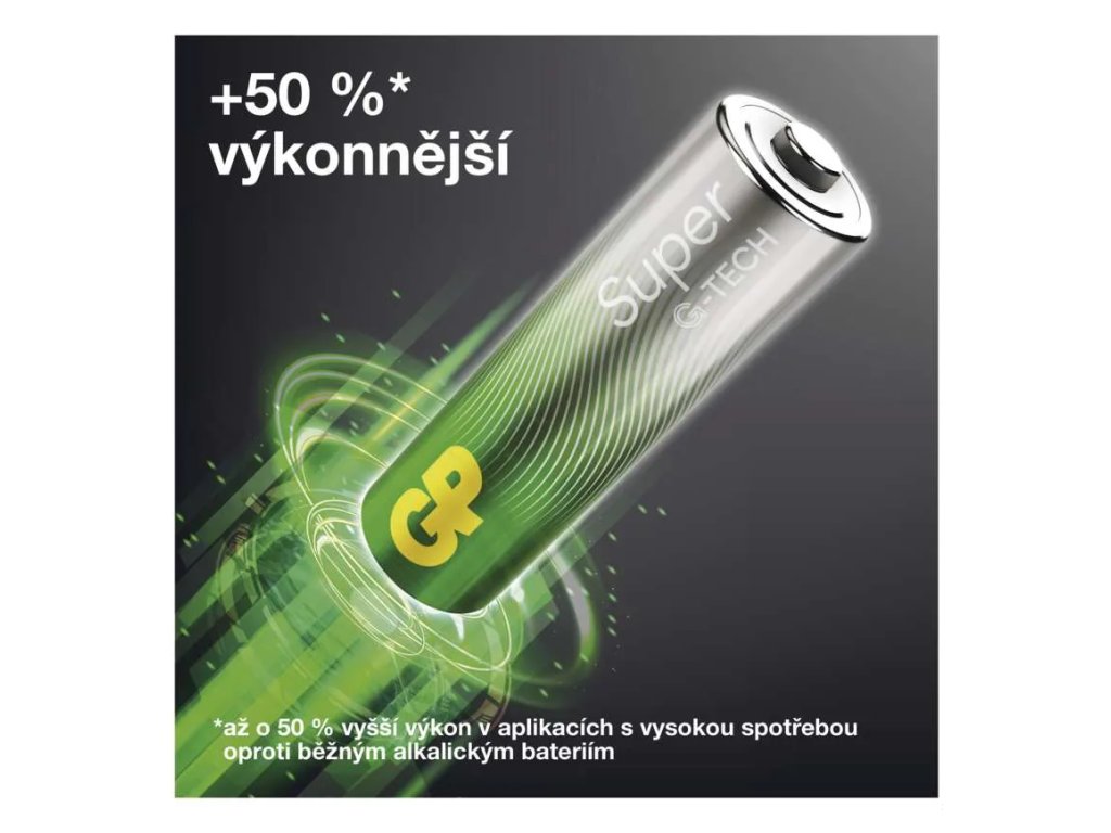 Pokud hledáte baterie, které vám poskytnou spolehlivou a dlouhotrvající energii pro vaše elektronické zařízení, sáhněte po nových alkalických bateriích GP SUPER, které jsou vybaveny revoluční technologií G-TECH s výdrží o 50 % větší oproti ostatním alkalickým bateriím.