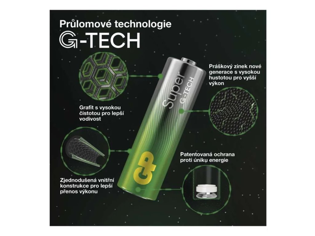 Technologie G-TECH využívá vysoko hustotní práškový zinek nové generace, který umožňuje rychlou a silnou výrobu energie, a zajišťuje tak vynikající výkon. Díky více kroužkovému jádru s vysoce čistým grafitem se zvyšuje elektrická vodivost, což přináší delší životnost energie. Inovativní interní konstrukce zvyšuje reakční plochu uvnitř baterie a zefektivňuje přenos energie v rámci článku. Dále je patentovaná technologie prevence proti úniku energie z baterie, která účinně zabraňuje vytečení a zajišťuje její bezpečné uzavření.