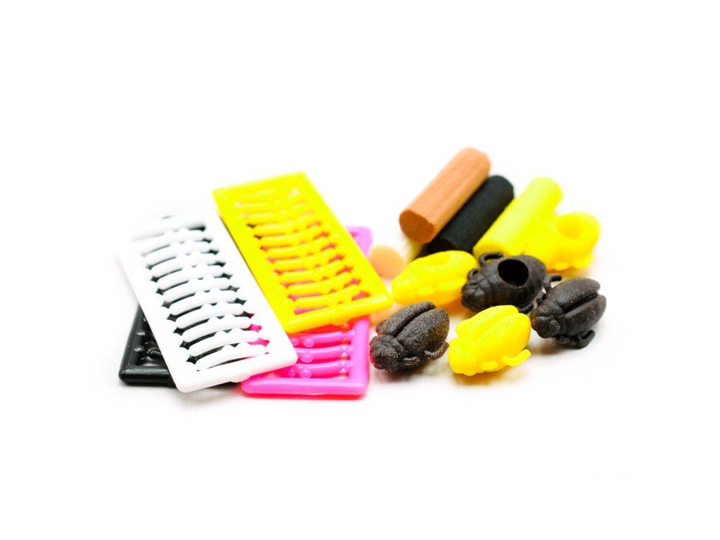 Balení obsahuje 6 umělých brouků (3 žlutý + 3 černý), 4 pěnové tyčky různých barev a 4 sady speciálních zarážek různých barev.Skvělá nástraha pro chytání způsobem zig-rig.