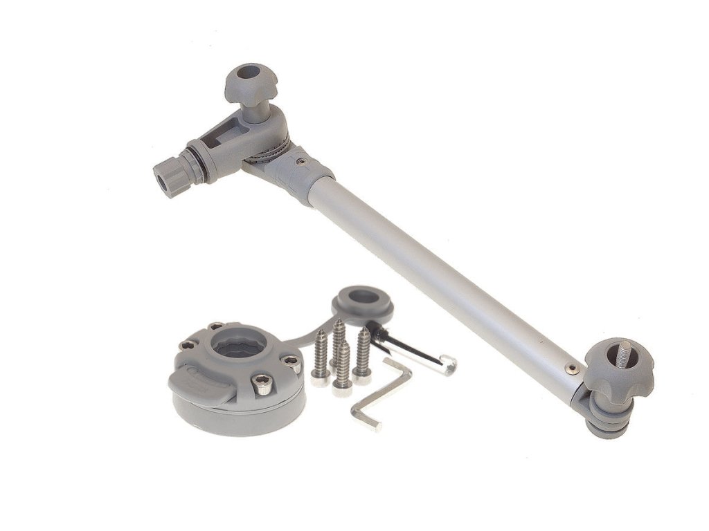 Držák sondy sonaru 300 mm v setu s rychloupínacím držákem FMB*. Velmi jednoduchý a praktický držák. Sonda se upevňuje na spodek držáku, kde je velká matice z pevného plastu a ozubené podložky, které umožňují jak velmi pevné upevnění sondy, tak možnost nastavování její polohy. Na vrchní části držáku je kloub umožňující správné nasměrování sondy a také upevňovací bod, který zasunete a pojistkou zajistíte do rychloupínacího držáku FMB*. Délka držáku 300 mm je optimální k naprosté většině nafukovacích člunů. Obvykle se připevňuje na zadní zrcadlo lodi.*FMB je univerzální rychloupínací držák se základnou (podložkou), díky jehož velmi jednoduše a spolehlivě fungujícímu zámku můžete připevnit jakékoli příslušenství k lodím, jako je sonda sonaru, držák prutů, deska pro obrazovku sonaru, držáky na tablety, telefony, foťáky či Go pro kamery, vazáky kotvy, upevňovací háčky, vesla, hrazdy a další. Všechny tyto Fasten příslušenství mají na koncích speciálně tvarovaný upevňovací bod, který snadno zapadne do rychloupínacího držáku. Pak už stačí jen zasunout pojistku a příslušenství je pevně spojeno s držákem. Držák je dodáván se čtyřmi vruty, čtyřmi šrouby a utahovacím imbusem. S pomocí vrutů nejprve přišroubujete základnu například do zadního zrcadla lodi, nebo jiné pevné desky. Vrchní část držáku poté snadno připevníte k základně pomocí šroubů.
