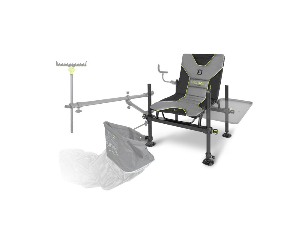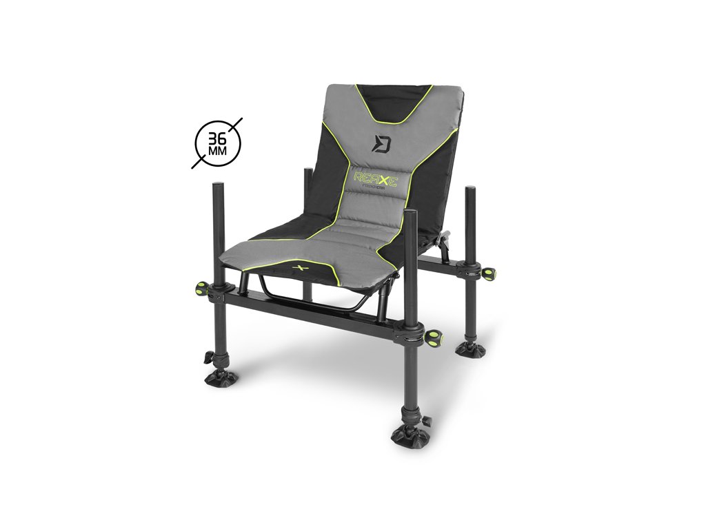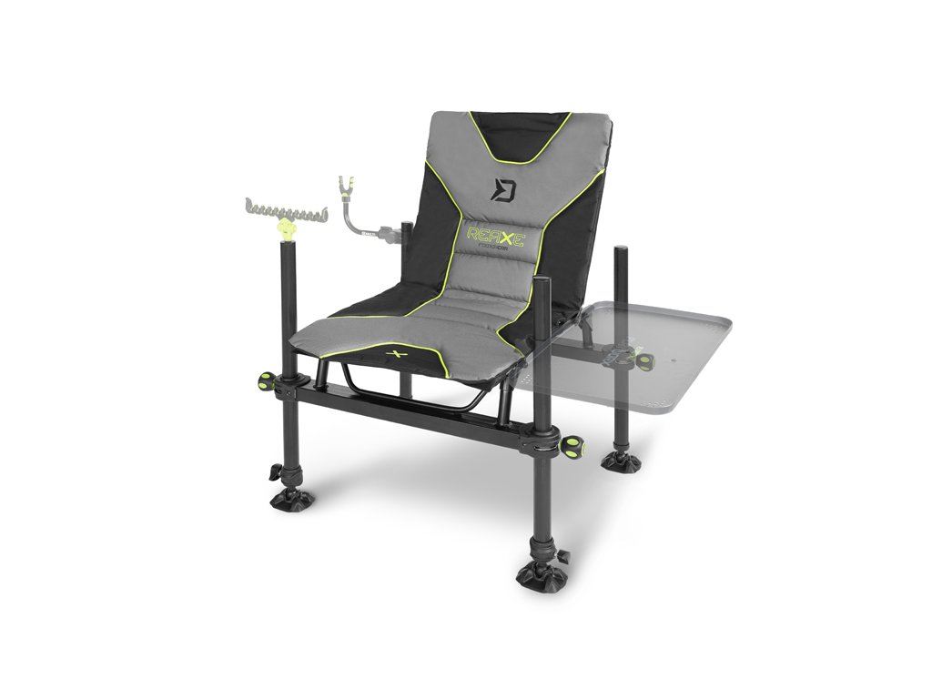 Na vrchu předních nohou se nacházejí univerzální závity, které lze využít pro uchycení různých feederových držáků nebo jiných doplňků. Sedací část je tvořena měkkou matrací, která umožňuje komfortní sezení během celodenního lovu. Barevně je laděna do šedo-černa, s výraznými zelenými doplňky ve stylu REAXE.