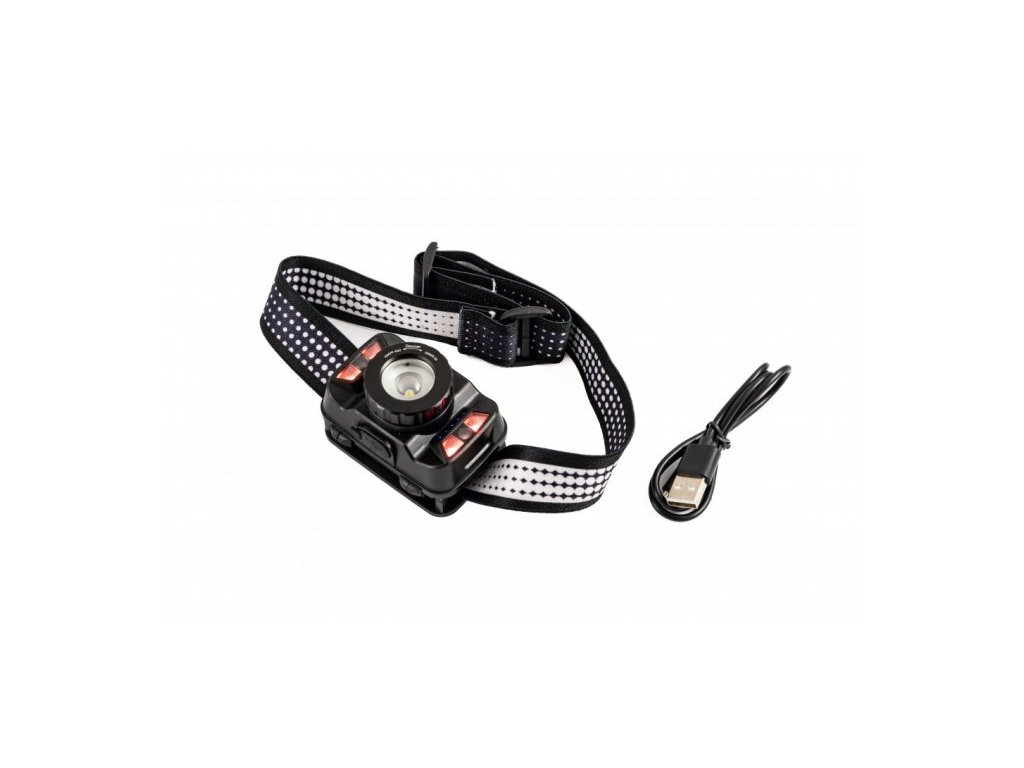 Tlačítko SENZOR - po stisku se aktivuje režim bezdotykového ovládání. Pohybem ruky do 25 cm od čelovky ovládáme bezdotykové zapnutí a vypnutí čelovky.