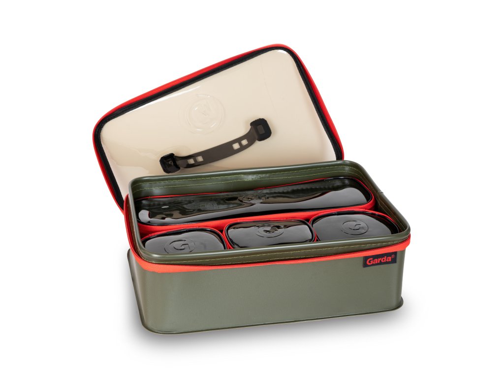 Garda EVA Master Case Set 4+1 o celkovém rozměru 37 x 25 x 12 cm je velmi praktické pouzdro a organizér, do kterého lze umístit veškeré rybářské pomůcky. Kromě hlavního pouzdra obsahuje i jedno dlouhé a tři menší vnitřní. Lze si tak dobře rozložit a oddělit různé typy pomůcek. Tyto menší pouzdra se prodávají i samostatně, a tak, pokud budete chtít, můžete si svůj set přetvořit podle vašich požadavků. Velkou výhodou je, že EVA materiál je velmi odolný, omyvatelný a voděodolný. Průsvitná vrchní část vám umožní poznat, co se v pouzdru nachází. Vrchní madlo usnadňuje přenášení.Doplňkové parametry