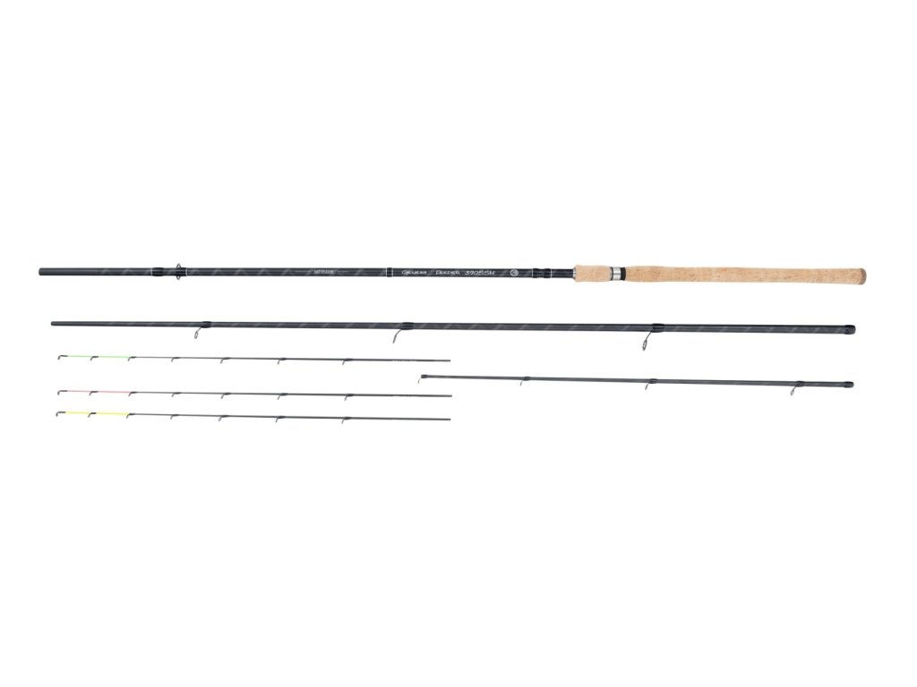 Robustní feederový prut nejvyšší třídy s velkou odolností a silovými rezervami. Speciální konstrukce blanku je zesílena křížem vinutými uhlíkovými pásy. Velká očka napomáhají dlouhým náhozům a výborně fungují při lovu větších ryb s použitím silnějších vlasců. Anatomicky tvarovaná korková rukojeť je zárukou pohodlného úchopu a příjemného zdolávání.Materiál - SHMC 80 - 65 Carbon.