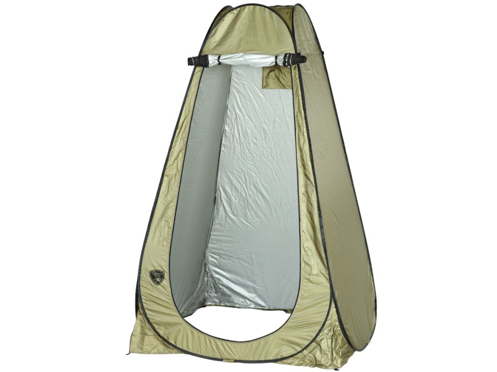 Lehký samorozkládací stan, který je určen pro přenosné toalety, sprchování v přírodě nebo jako převlékárna. V nejvyšším bodě má výšku 190cm a je dodáván včetně 4ks ukotvovacích kolíků. Velmi rychle a jednoduše lze postavit. Je dodáván včetně přepravního obalu. Specifikace: - neprůhledný materiál SilverCoat - použitá tkanina: 200T Polyester Taffeta - UV ochrana: UV50+ - tkanina nepropustná větru a nemění tvar - nepromokavost: 2000mm vodního sloupce (běžné použití, mírný déšť, přeháňky) - vnitřní konstrukce: ocelový drát - ventilační otvory na zip ve vrchní části - 1x vnitřní kapsa - 4x kotvící kolík - 4x stabilizační šnůrka - rozměry: 120 x 120 x 190 cm - hmotnost: 2.10 kg - barva: zelená