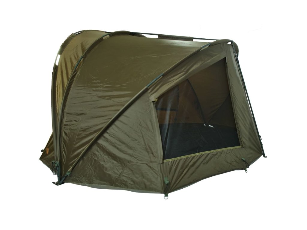 Přístřešek trubkové konstrukce, která se skládá ze tří žeber a o výztuhu se starají rozpěrné teleskopické tyče. Na tento bivak, byl použit vodě odolný materiál 5 000mm HH, té nejvyšší kvality, který je 100% nepromokavý a máme ho prověřený u řady našich úspěšných modelů. Páskou podlepené švy a ukotvení na zavrtávací kolíky, které jsou v ceně přístřešku. Bivak je vybaven větracím systémem jak v přední části, tak v zadní části najdete dvě obří ventilační okna, které zajistí maximální odvětrání. Velký přední kšilt nad vchodem, je navíc osazen dvěma praktickými úchyty na pruty. Přední vchodová část má tři výměnné panely na suchý zip, celo zakrytá, slída nebo moskytiéra. Další vychytávkou tohoto bivaku je, že v nepřízni počasí můžete ve vchodové části vytvořit okénko, díky použití dvojitých jezdců zipu. Součástí bivaku je přepravní nylonová taška.Rozměry:
