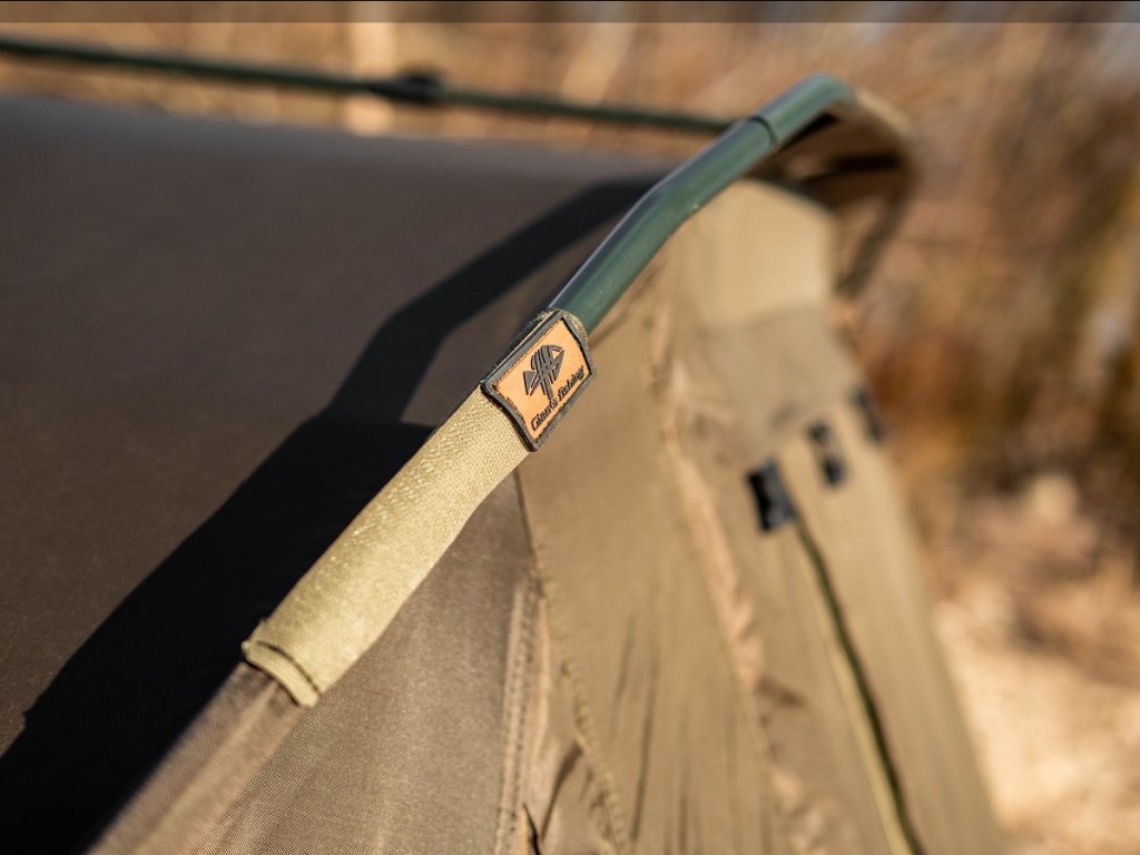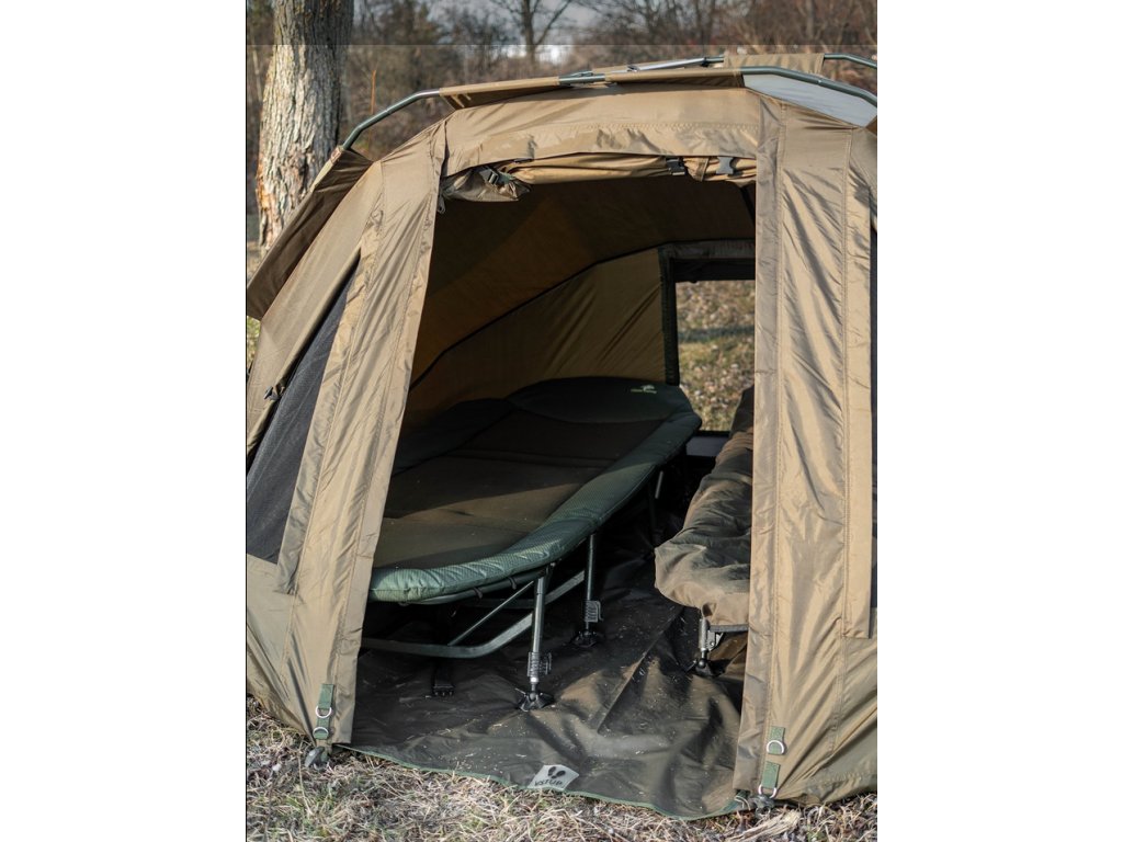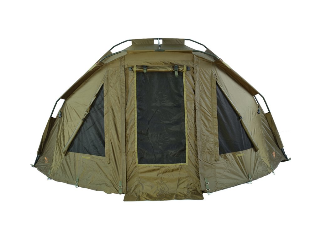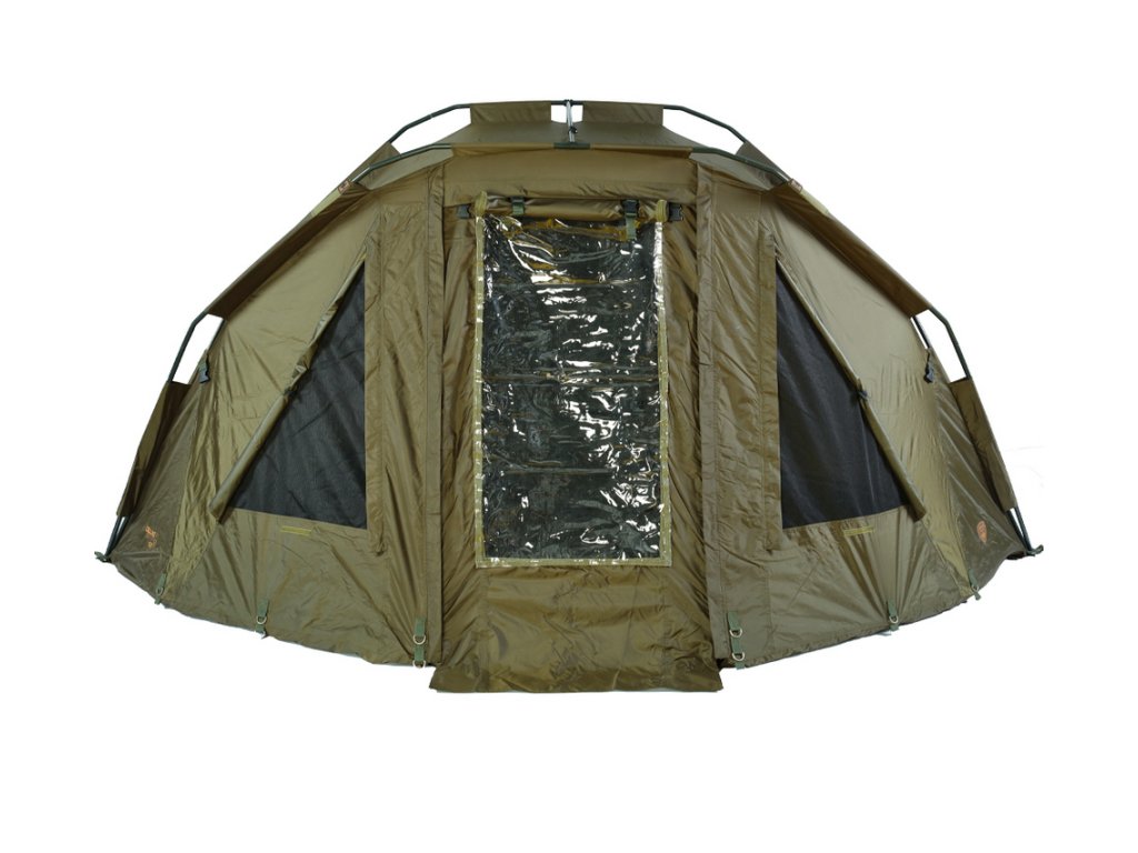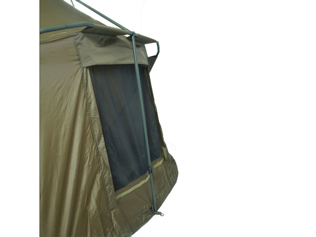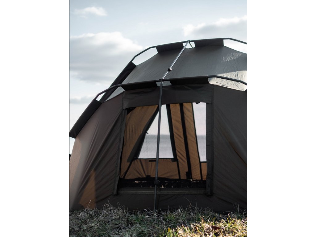 Přístřešek trubkové konstrukce, která se skládá ze tří žeber a o výztuhu se starají rozpěrné teleskopické tyče. Na tento bivak, byl použit vodě odolný materiál 5 000mm HH, té nejvyšší kvality, který je 100% nepromokavý a máme ho prověřený u řady našich úspěšných modelů. Páskou podlepené švy a ukotvení na zavrtávací kolíky, které jsou v ceně přístřešku. Bivak je vybaven větracím systémem jak v přední části, tak v zadní části najdete jedno větší ventilační okno, které zajistí maximální odvětrání. Přední vchodová část má tři výměnné panely na suchý zip, celo zakrytá, slída nebo moskytiéra. Součástí bivaku je přepravní nylonová taška.