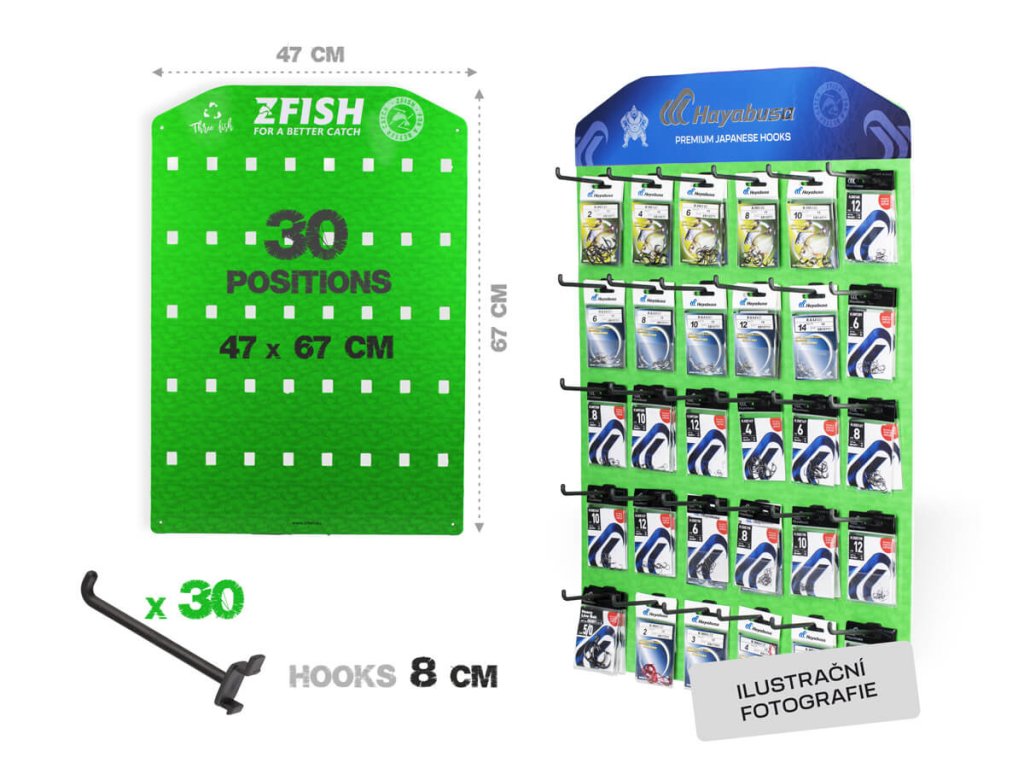 Ideálním pomocník pro dokonalou prezentaci kompletního sortimentu prémiových japonských háčků. Kvalita materiálu a zpracování těchto plat spolu s elegantním designem zajistí, že se na Vaší prodejně rozhodně neztratí a jsme si jistí, že neunikne pozornosti žádného zákazníka. Plato disponuje velkou plochou k zavěšení produktů na prodejní háčky. Součástí balení těchto plat jsou samozřejmě i samotné závěsné háčky a to v počtu 30 ks