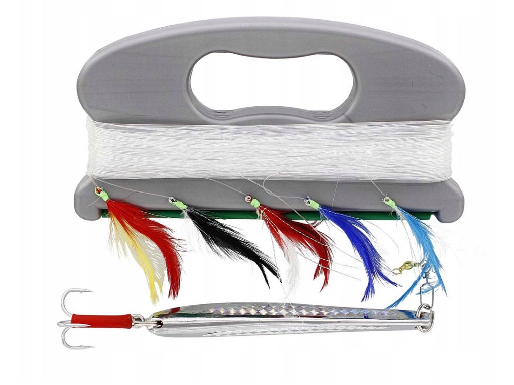 Je to briliantní a klasický mořský navíječ. Je velmi efektivní na makrely, tresky a polaky. Vypadá přirozeně díky 5 háčkům s peříčkama v nejlepších barvách. Zatěžkán je 200g stříbrným holografickým pilkerem. Makrely mu nedokáží odolat.