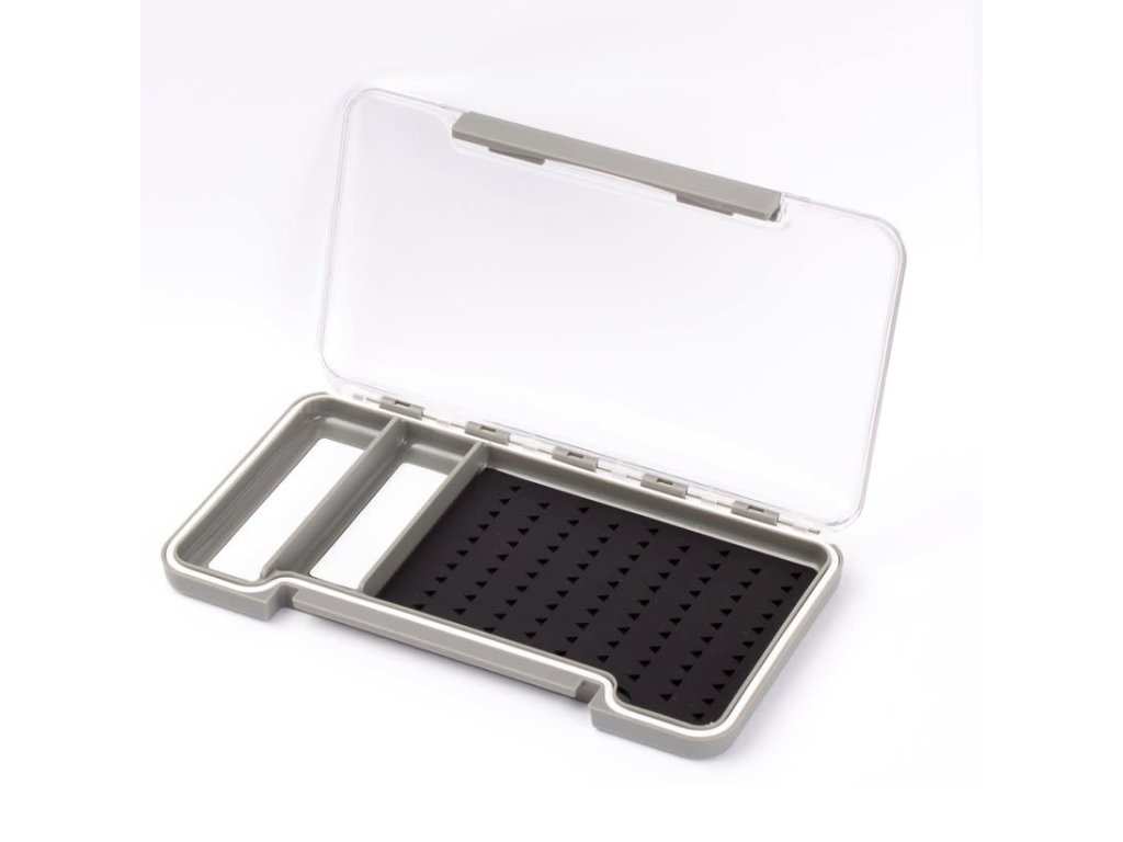 Muškařská krabička ve standartním rozměru, kompaktní a výborně se hodí na uskladnění vaších mušek. Její výhodou je transparentní víko, které nám dává absolutní přehled nad uspořádáním jednotlivých mušek. Vyplň krabičky je z černé silikonové pěny a díky rychlému a bezpečnému vodě odolnému uzávěru jsou maximálně v bezpečí. Navíc krabička obsahuje dvě magnetická políčka pro upevnění hlaviček pro dodatečné doplnění váhy nebo pro suché mušky. Na krabičce je také natištěno mezinárodní měřítko háčků pro přesnou délku háčku.Doplňkové parametry