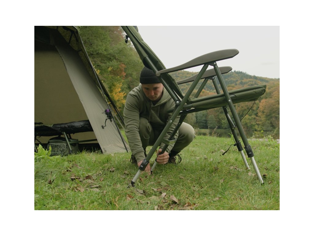 Výškově nastavitelné nohy umožňují přizpůsobit křeslo nerovnému terénu a zaručují stabilitu i v náročných podmínkách. O bezpečné zajištění polohy se starají flexibilní robustní patky, jejichž velká plocha účinně zabraňuje zapadnutí nohou do měkké půdy u vody. Navíc je křeslo vybaveno plastovým klipem, který fixuje jeho polohu během převozu a předchází nechtěnému rozevírání.