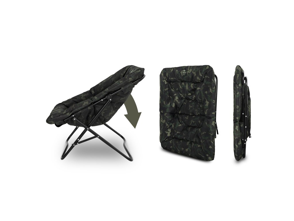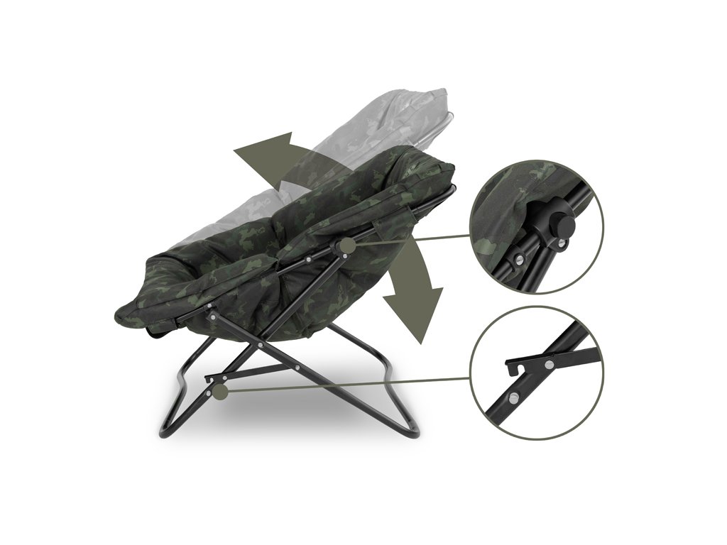 Jeho základ tvoří pevná X-ková kovová konstrukce, kterou lze složit nebo rozložit doslova během vteřiny. Tento typ konstrukce zaručuje vysokou stabilitu a zároveň si po složení zachovává co nejkompaktnější rozměry. Konstrukce je navíc polohovatelná a za pomoci plastových pojistek si tak můžete křeslo nastavit až do tří poloh. Aby se zamezilo nechtěnému složení křesla během sezení, je křeslo vybaveno zajišťovacím mechanismem.