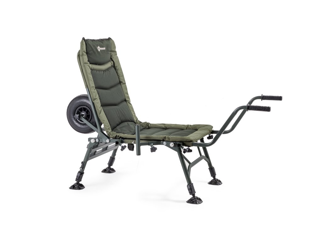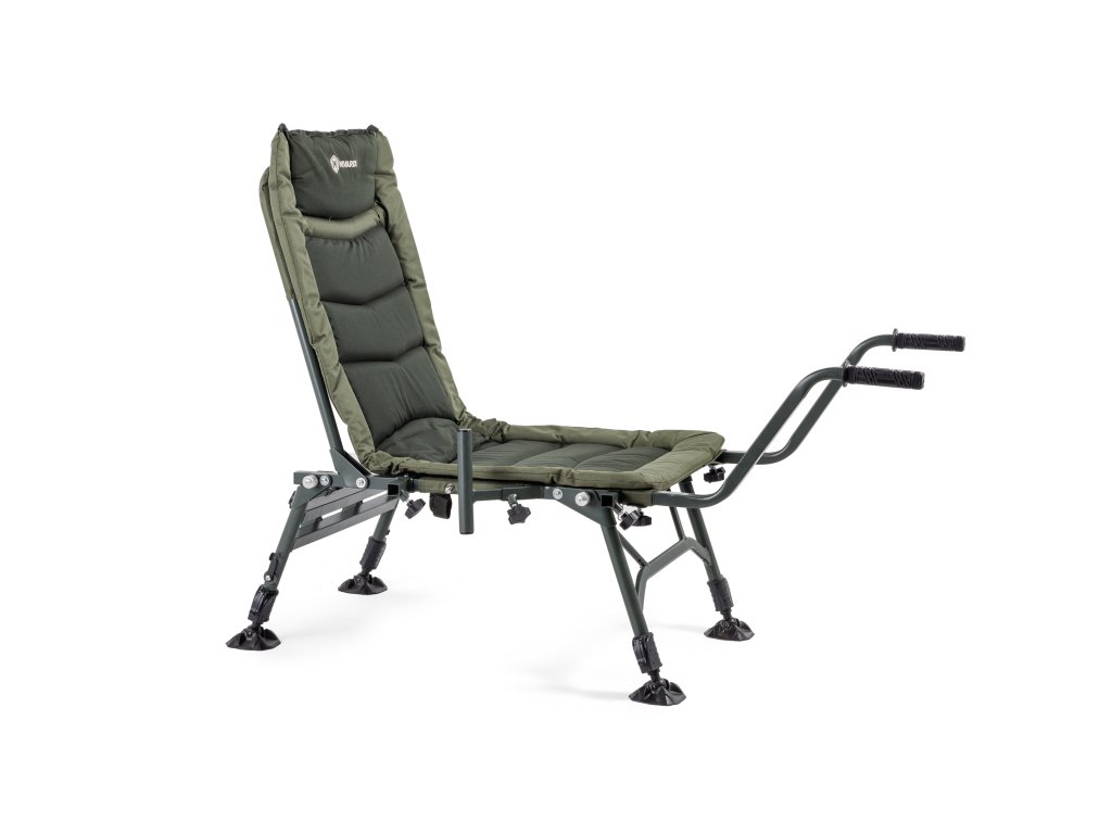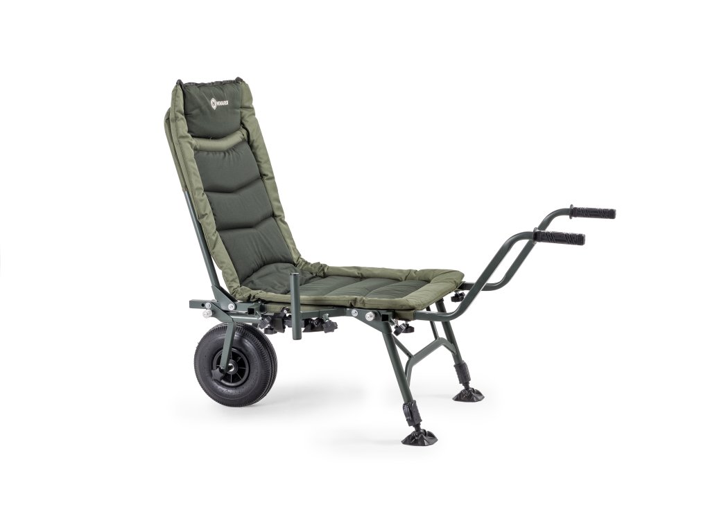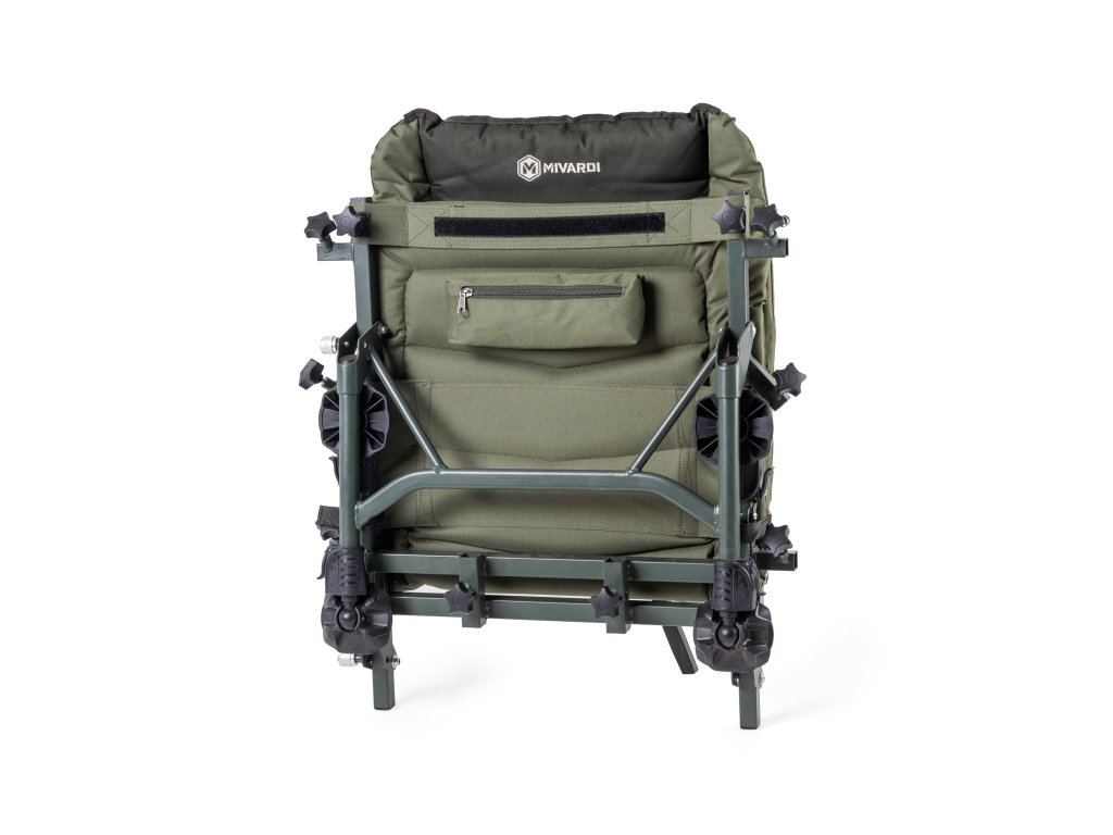 Značkou Mivardi od základu navržené multifunkční křeslo s prodlouženým opěradlem a důmyslným systémem volitelných bočních adaptérů na stolky, držáky a další příslušenství. Ty mohou být umístěny až v osmi různých pozicích po obvodu křesla. Čtyři teleskopické nohy jsou osazeny velkými patkami proti zaboření. Z křesla lze během okamžiku vytvořit robustní přepravní vozík s nafukovacím kolem a dvěma rukojeťmi. Součástí dodávky je omyvatelný ochranný návlek na matraci a jeden boční adaptér na příslušenství. Křeslo i vozík mají nostnost 150kg. Vítěz ceny GRAND PRIX za nejlepší exponát v kategorii plavaná a feeder a rovněž vítěz hlavní ceny GRAND PRIX za nejlepší exponát rybářského veletrhu For Fishing 2018.- ke křeslu je možné dokoupit další adaptéry na příslušenství