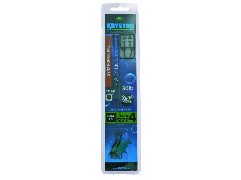 Synx Ronnie rig je velmi účinný návazec především pro plovoucí nástrahy. Je na něj použit japonský Curve X háček a 20cm dlouhý potahovaný Synx, který je velmi odolný a zároveň díky své tuhosti výrazně snižuje riziko zamotání Háček je připevněn na Ronnie obratlík a zajištěn smršťovací hadičkou. Na háčku je zavrtávací držák nástrah, do nějž snadno upevníte plovoucí nástrahu. Balení kromě 2ks návazců obsahuje i 3x 2ks různě dlouhých prodlužovacích vlasových zarážek a kousek speciálního tmelu Heavy Metal na vyvážení plovoucí nástrahy. Tmel můžete nanést na obratlík nebo na uzel pod Ronnie obratlíkem. Hotové návazce Kryston jsou z prvotřídních komponentů, špičkových japonských háčků a zejména legendárních Kryston šňůrek a fluorocarbonů.
