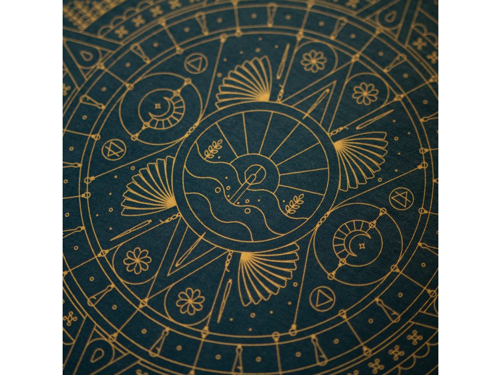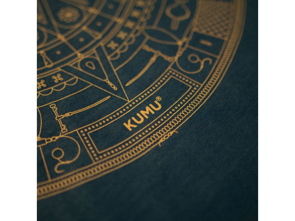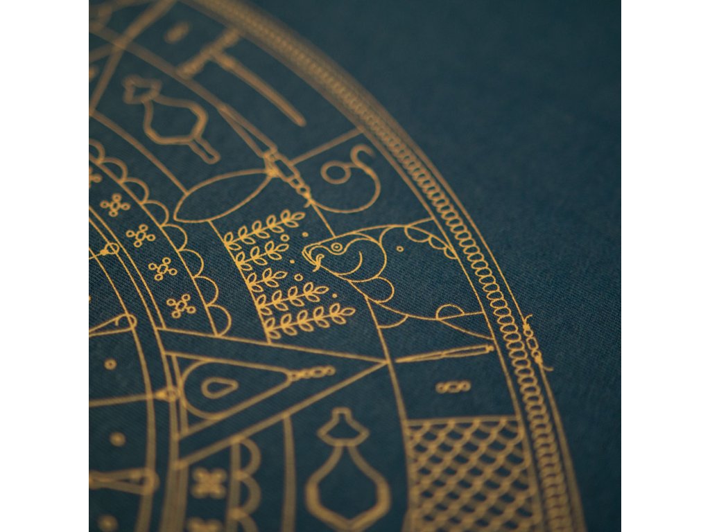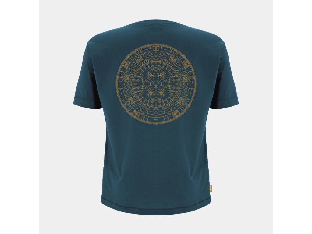 KUMU Tričko 5th Sun Naše tričko 5th Sun, inspirované aztéckým uměním, musí být opravdu důkladně prozkoumáno, aby bylo možné plně docenit všechny detaily, které na něm naleznete. Vytištěno na naší super měkké látce 140 g/m2 v temně akvamarínově modré barvě s tkanými detaily na boční poutce.Doplňkové parametry