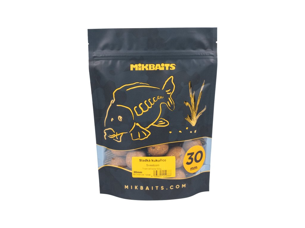 30 mm boilie jsou velkou selektivní nástrahou, která na jedné straně limituje záběry od nechtěných ryb, a naopak je lákavá pro velké trofejní kusy kaprů. Sladká kukuřice patří do řady eXpress, protože tak jako ostatní příchutě této řady patří k nejrychleji působícím boilie, jaké kde můžete sehnat. Má ale odlišné složení, které záměrně neobsahuje žádné rybí moučky, ale o to víc ptačích zobů, sypkých i tekutých kukuřičných výtažků a chuťově atraktivních přísad. To z něj dělá naprosto celoroční boilie, jehož účinnost bude stoupat tam, kde ryby mají boilie z rybích mouček už prokouknuté. Taktéž je to skvělá varianta na revíry, kde jsou problémy se sumci a sumečky. Sladká kukuřice funguje okamžitě bez předkrmování, a to i s minimem návnady. Lze ji bez obav použít i při dlouhodobějším rybolovu nebo silnějším vnadění, aniž by začala ztrácet účinnost. Dá se použít po celou sezónu včetně chladných období.