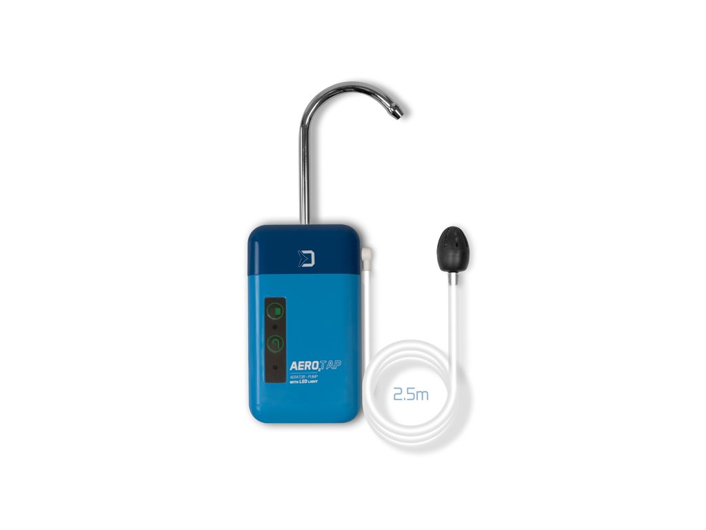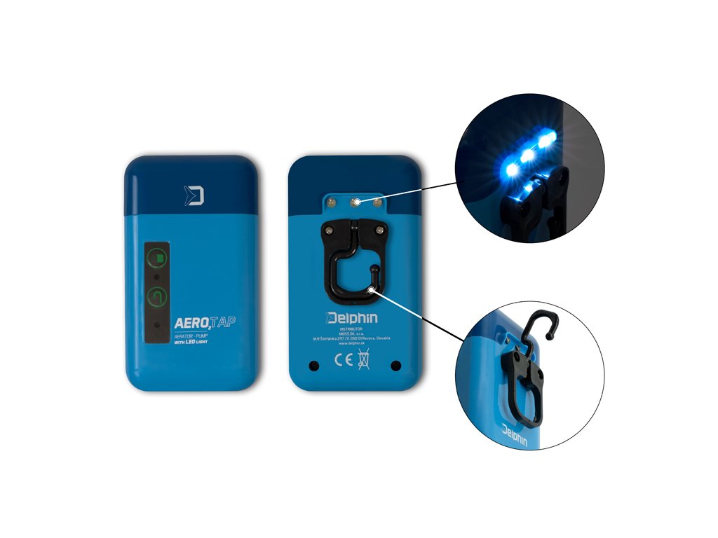 Výkon 3 litry za minutu poskytuje maximální komfort nástražním rybkám i během přesunu na větší vzdálenosti. AeroTAP lze využít také jako vodovodní kohoutek, v tom případě čerpadlo poskytuje výkon 1 litr vody za minutu. Používání okysličovače usnadňuje také pohybový senzor, který je připraven během celého pobytu u vody. Okysličovač má také závěsný háček umístěný přímo na těle, umožňující jeho upevnění ať už na kbelík, bivakovou konstrukci apod. Výdrž baterie až 8 hodin postačuje i na delší přesuny bez auta nebo jiné možnosti dobití baterie. Pokud je AeroTAP používán jako čerpadlo, dokáže nepřetržitě fungovat až 2 hodiny. Součástí balení je také sací hadička, filtr na odstraňování nečistot při používání čerpadla a vzduchovací kámen pro důsledné okysličení vody. Díky závitu na spodní části okysličovače jej lze uchytit i na různých stojanech. Pro usnadnění používání během nepříznivých světelných podmínek je na zadní straně umístěno světlo, které můžete použít i pro osvětlení lovného místa. Delphin AeroTAP je tedy užitečným pomocníkem pro každého rybáře během krátkých i dlouhých výprav.