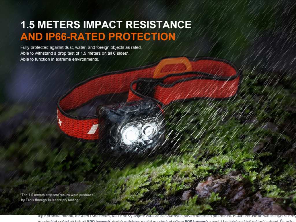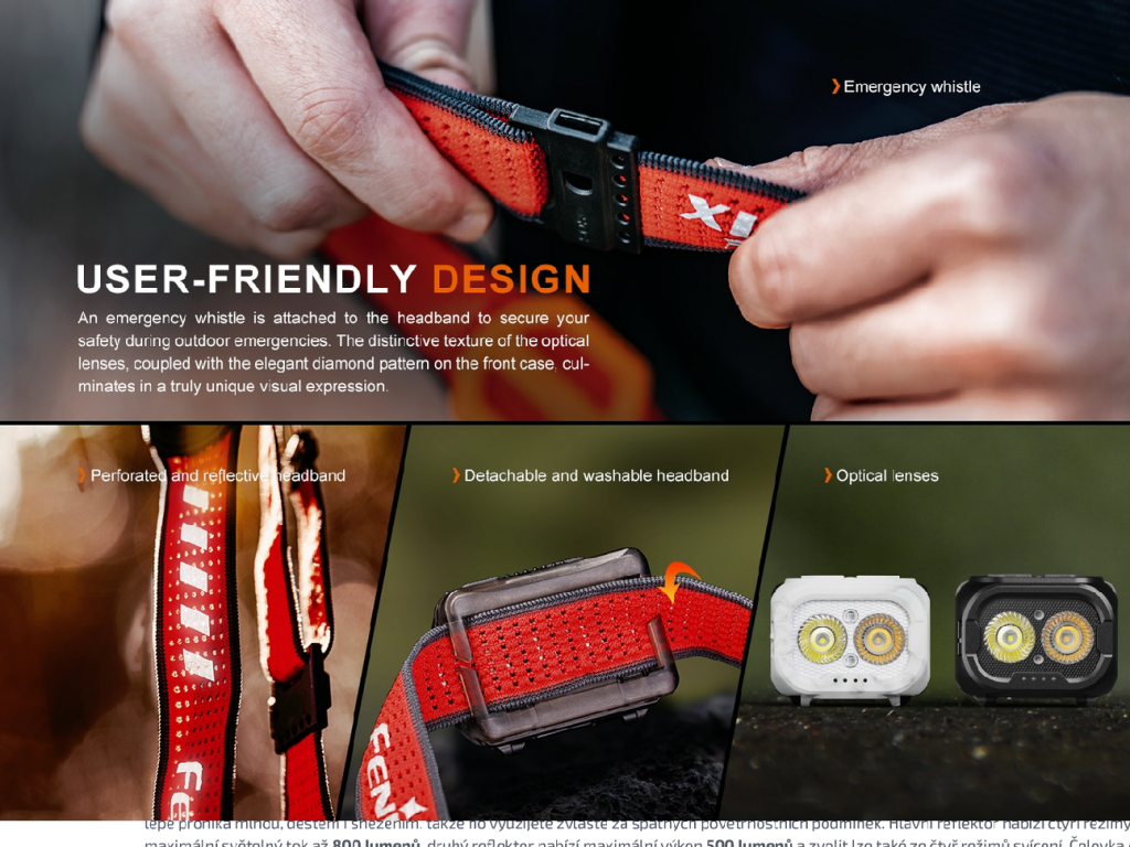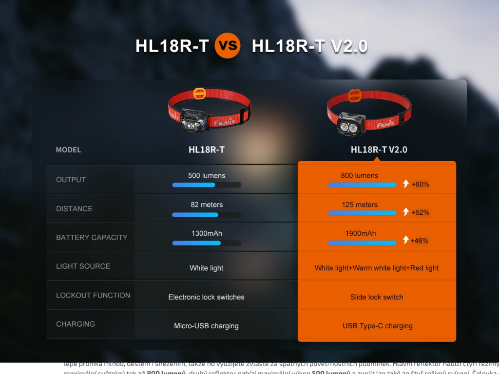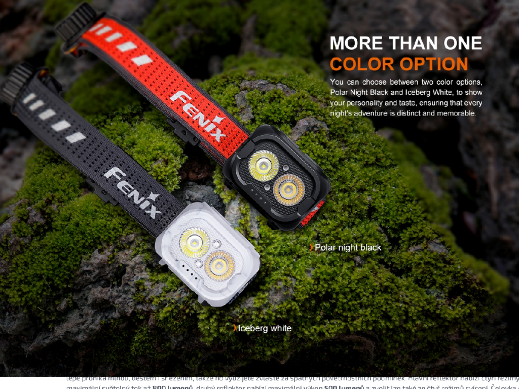 Kompaktní nabíjecí čelovka Fenix HL18R-T V2.0 se vyznačuje praktickou konstrukcí se dvěma reflektory, světelným tokem až 800 lumenů (ANSI) a dosvitem až 125 metrů. Reflektory vytváří dobře zaostřené světelné paprsky, které svítí do dálky i na blízko zároveň. Hlavní reflektor svítí chladným bílým světlem cca 6500K (tzv. denní bílá) a sekundární svítí teplým bílým světlem s odstínem cca 3000K (kužely však nelze kombinovat). Teplé světlo lépe proniká mlhou, deštěm i sněžením, takže ho využijete zvláště za špatných povětrnostních podmínek. Hlavní reflektor nabízí čtyři režimy svícení a maximální světelný tok až 800 lumenů, druhý reflektor nabízí maximální výkon 500 lumenů a zvolit lze také ze čtyř režimů svícení. Čelovka disponuje také červeným světlem, červeným SOS blikáním a píšťalkou integrovanou na popruhu pro krizové situace. Napájení zajišťuje vyměnitelný Li-ion akumulátor o kapacitě 1900 mAh, který se nabijí přes USB-C konektor přímo v čelovce. Akumulátor je možné vyjmout a v nouzi nahradit třemi bateriemi AAA (nelze je v čelovce nabíjet).