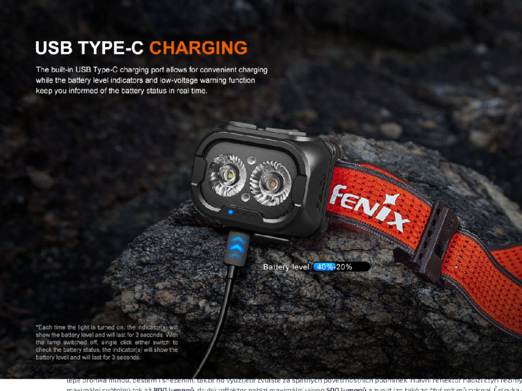 Nabíjení - odklopte protiprachovou krytku a zapojte nabíjecí kabel USB-C do nabíjecího portu čelovky. Po dokončení nabíjení protiprachovou krytku nasaďte zpět. Běžná doba nabíjení je 3 hodiny s USB zdrojem 5 V/1 A pro zcela vybitou čelovku. Během nabíjení lze používat čelovku pouze v nízkém režimu libovolného reflektoru. V procesu nabíjení postupně svítí a blikají čtyři indikátory. Čtyři trvale zapnuté značí, že nabíjení je dokončeno.