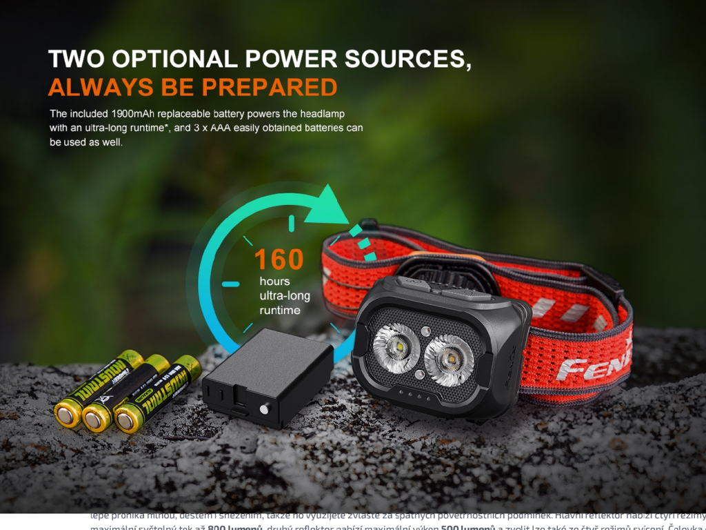 - Lze napájet 3x AAA bateriemi. Je možno použít jednorázové alkalické i nabíjecí NiMH či Li-ion s konstantním napájením 1,5 V. (Nelze je v čelovce nabíjet).
