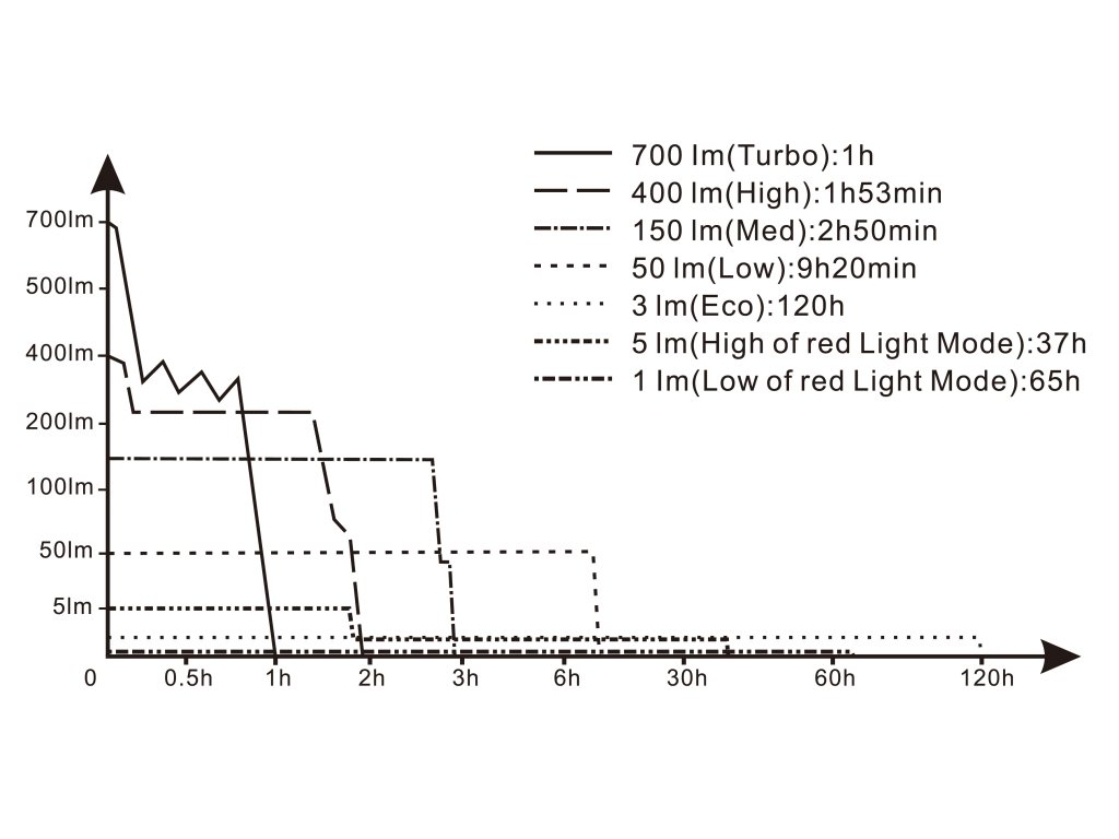 - Pět režimů bílého světla: 700 lumenů (1 hodina) -> 400 lumenů (1,8 hodiny) -> 150 lumenů (2,8 hodiny) -> 50 lumenů (9,3 hodiny) -> 3 lumeny (120 hodin)
