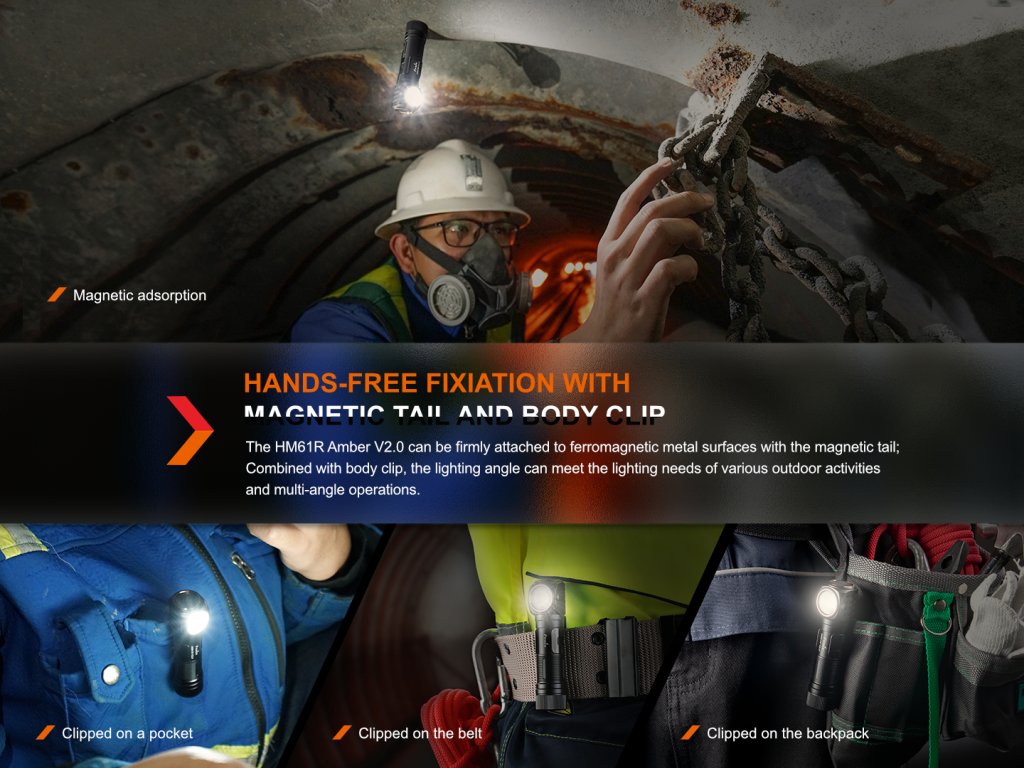Nová generace nabíjecí čelovky Fenix HM61R Amber V2.0 nabízí světelný tok až 1600 lumenů (ANSI) neutrálního bílého světla (4500 K) s dosvitem až 162 metrů. Vybavena je i červenými LED Everlight. Napájí ji jeden nabíjecí Li-ion akumulátor typu 18650 s kapacitou 3400 mAh, který se dobíjí přímo ve svítilně přes magnetický konektor, nouzově lze k napájení použít i dvě jednorázové lithiové baterie CR123A. Akumulátor má navíc zabudovaný USB-C konektor, takže ho lze snadno nabíjet i mimo čelovku bez magnetického kabelu. V ovládacím tlačítku je zabudovaná indikační LED, díky které budete vždy vědět, kdy akumulátor dobít. Koncovka svítilny je magnetická, takže ji lze snadno uchytit na cokoliv železného. HM61R Amber V2.0 disponuje osmi různými režimy osvětlení, které umožní volit mezi vysokým výkonem a dlouhou výdrží (až 400 hodin). Svítilna je napájena digitálně kontrolovaným konstantním proudem pro zaručení stálého světelného výkonu i při snižování napětí v bateriích (při jejich pozvolném vybíjení).