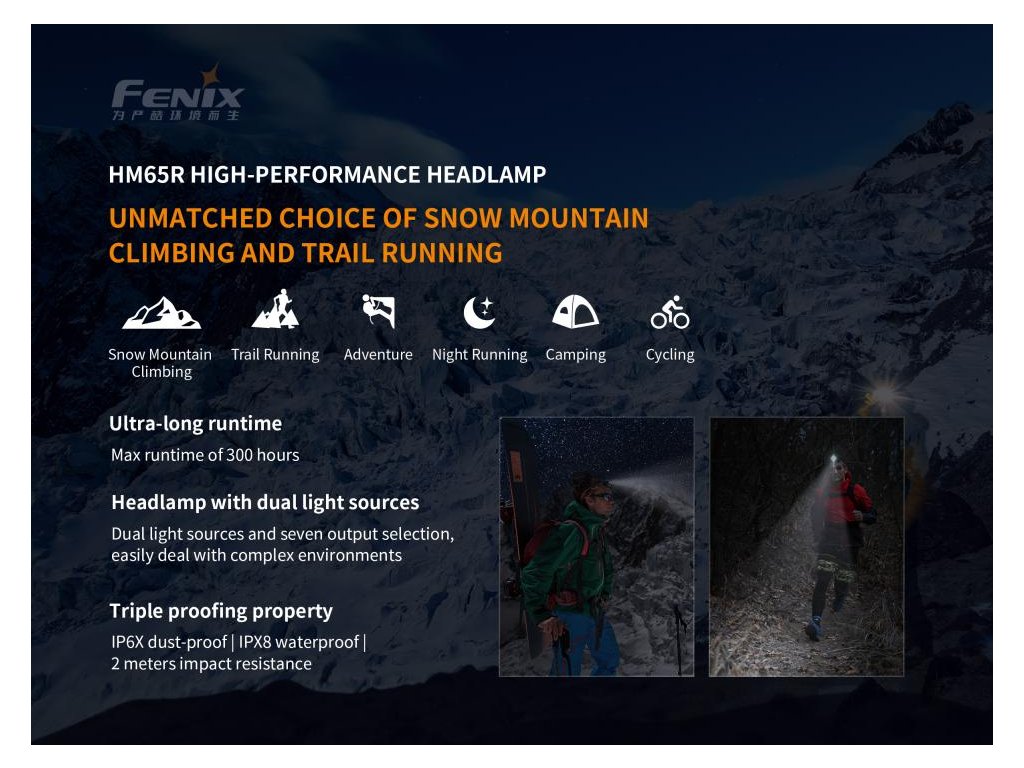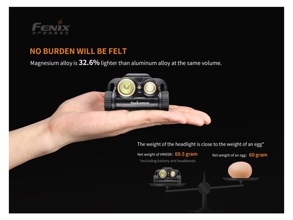 Nabíjecí čelovka Fenix HM65R se vyznačuje konstrukcí z lehké magnéziové slitiny, vysokou odolností proti vodě i pádu, unikátní konstrukcí se dvěma reflektory a celkovým výkonem až 1400 lumenů. Jeden reflektor vytváří dobře zaostřený světelný paprsek s dosvitem až 163 metrů a druhý reflektor má světelnou stopu velmi širokou a plynulou. Světelný tok dálkového reflektoru je až 1000 lumenů, reflektor s širokým kuželem nabízí maximální výkon 400 lumenů a neutrální odstín světla. Ovládání obou LED je na sobě nezávislé, světlo z obou reflektorů lze libovolně kombinovat a dosáhnout tak světelného toku až 1400 lumenů. Dálkový reflektor nabízí čtyři stupně svícení a široký reflektor tři režimy. K napájení používá jeden Li-ion akumulátor typu 18650 s kapacitou 3400 mAh, který je součástí balení a nabíjí se přes moderní USB-C konektor přímo v čelovce. V případě nouze lze čelovku napájet dvěma jednorázovými bateriemi CR123A.