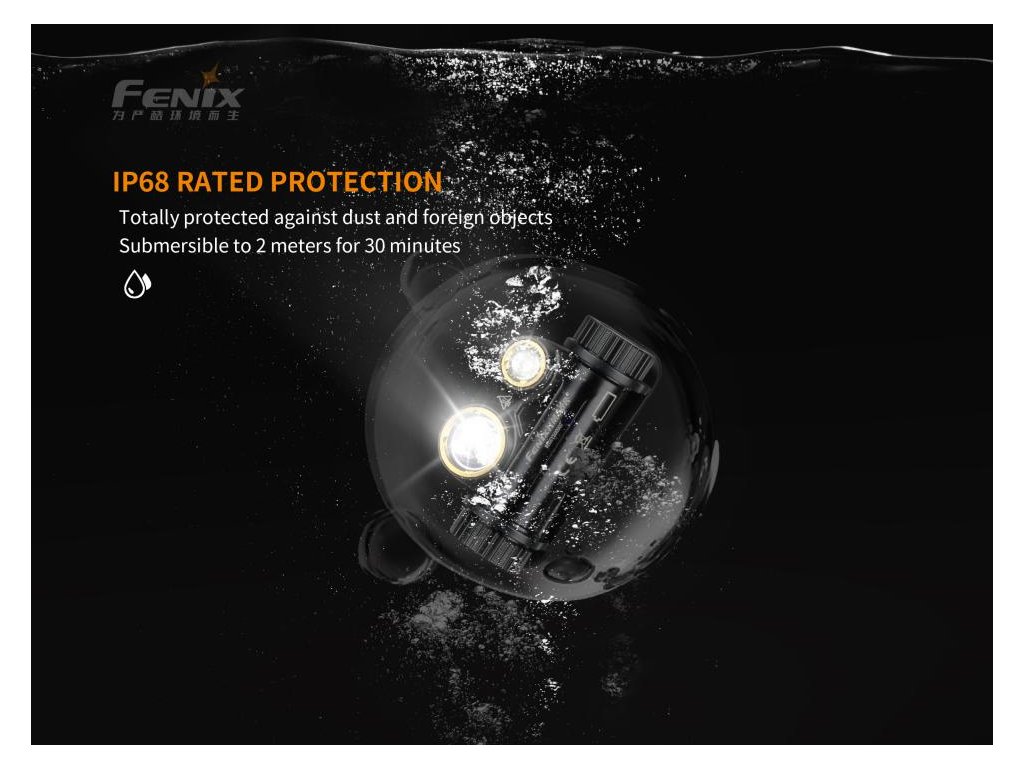 - Součástí balení je Li-ion akumulátor Fenix 18650 3400 mAh, popruhy na hlavu, nabíjecí kabel USB-C, náhradní o-kroužek.