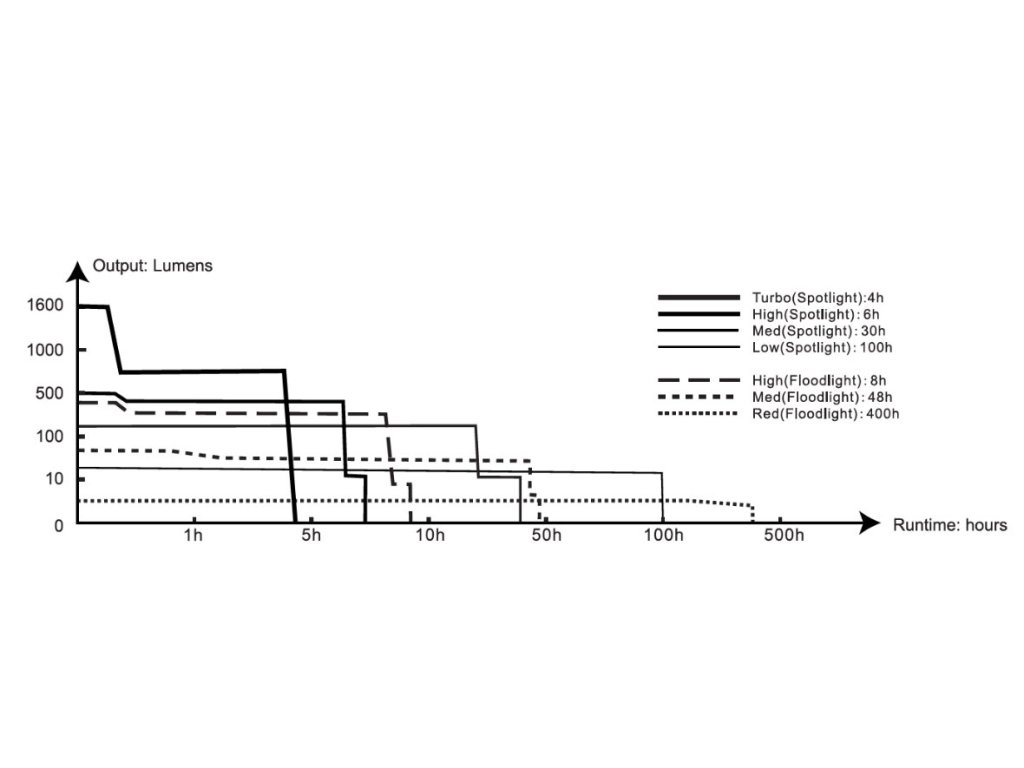- Dálkový reflektor: 1600 lumenů (4 hodiny) -> 500 lumenů (6 hodin) -> 150 lumenů (30 hodin) -> 30 lumenů (100 hodin).