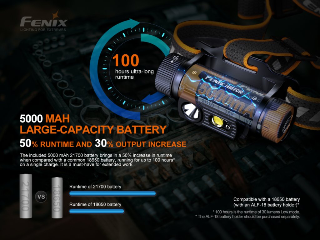 - K napájení používá jeden nabíjecí Li-ion akumulátor 21700, který je součástí balení. V případě nouze lze použít i jeden Li-ion akumulátor 18650, ale je potřeba dokoupit redukci ALF-18.