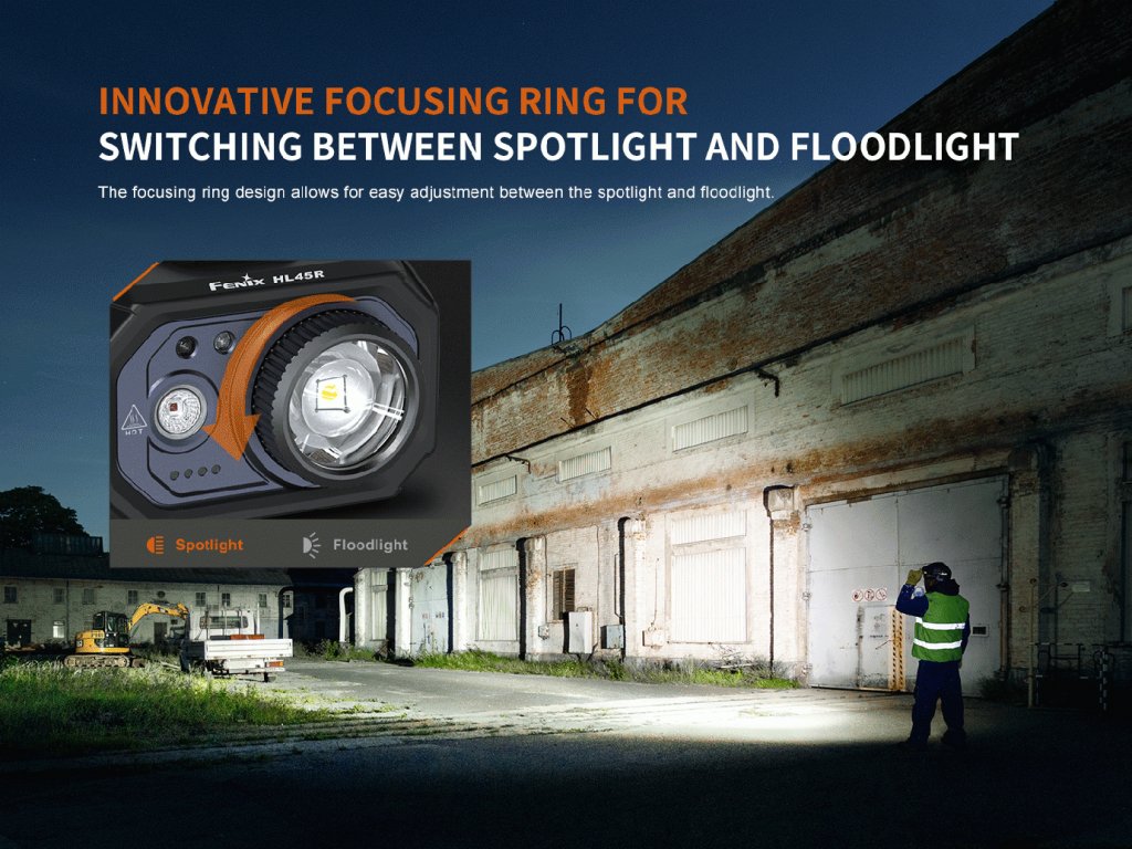 Zoomovací nabíjecí čelovka Fenix HL45R přináší světelný tok až 1000 lumenů (ANSI) a dosvit až 220 metrů a a funkcí pro bezdotykové zapínání a vypínání. Funkce Gesture-sensing umožňuje vypínat a zapínat světlo mávnutím ruky před čelovkou (funkci lze deaktivovat). Takže můžete mít při práci ruce od bláta, olejů a čehokoli a svítilna zůstane stále čistá. Napájení zajišťuje Li-ion akumulátor o kapacitě 1900 mAh, který se nabijí přes USB-C konektor přímo v čelovce. Akumulátor je možné vyjmout a v nouzi nahradit třemi běžnými bateriemi AAA (nelze je v čelovce nabíjet). Zdrojem světla je moderní LED Luminus SFT-25R, její světlo usměrňuje speciální TIR (Total Internal Reflection) optika s možností nastavení šířky světelného kuželu (funkce zoom). Navíc disponuje také červenou LED OSRAM GR QSSPA1.23, která dosahuje výkonu až 130 lumenů.