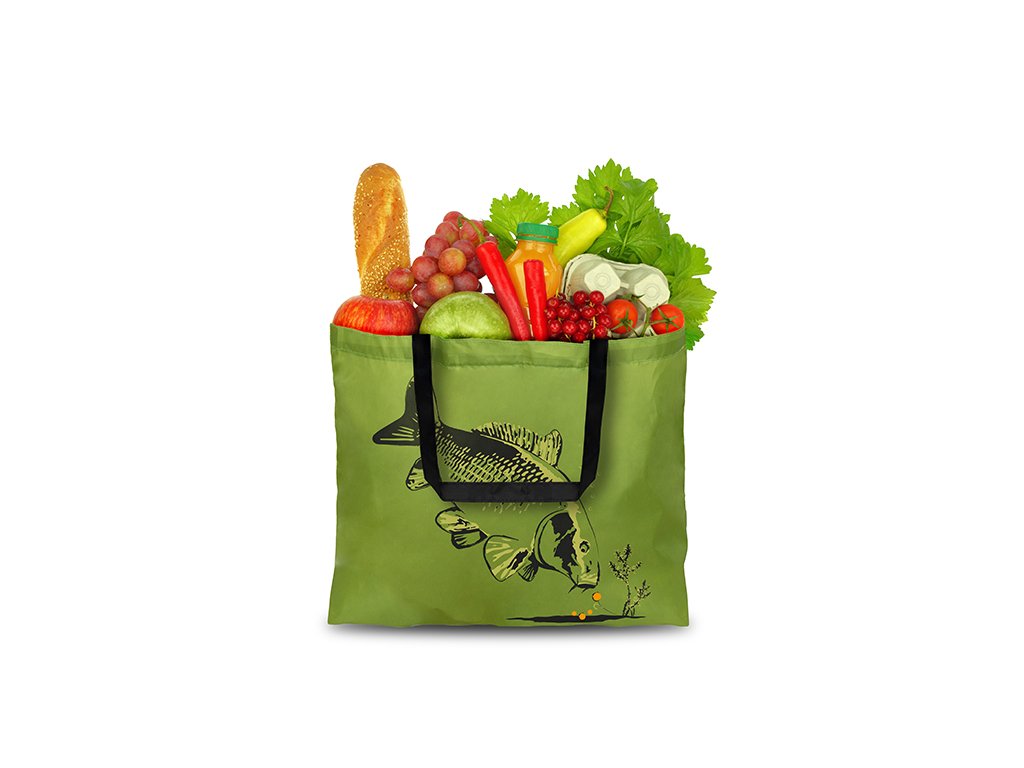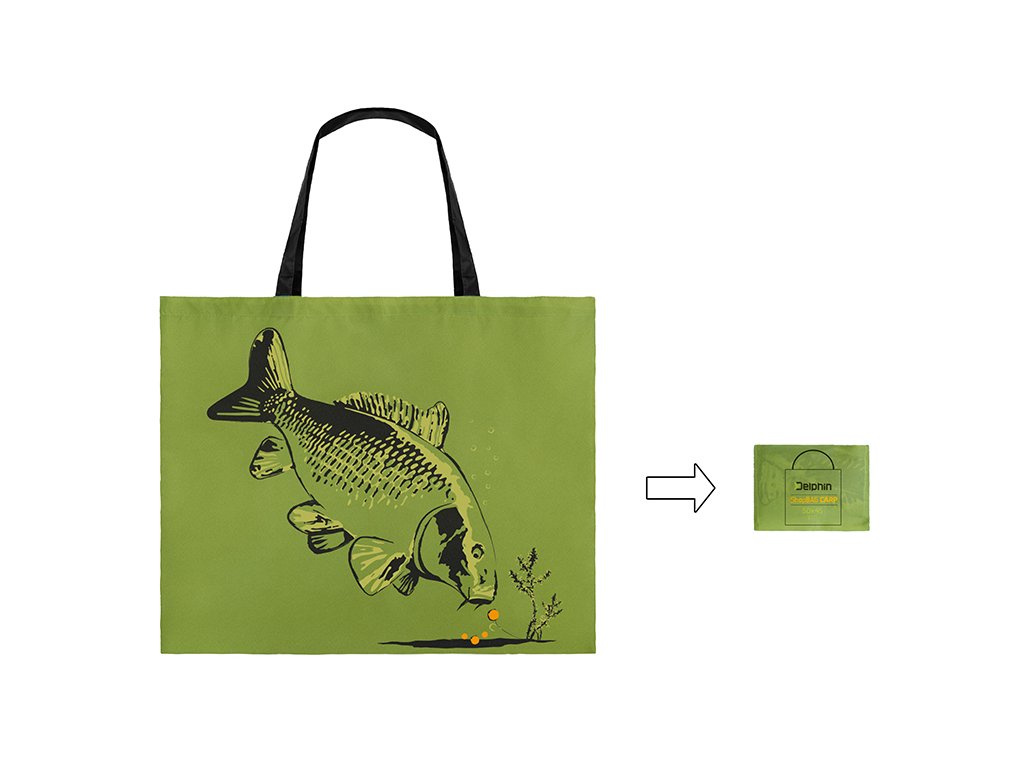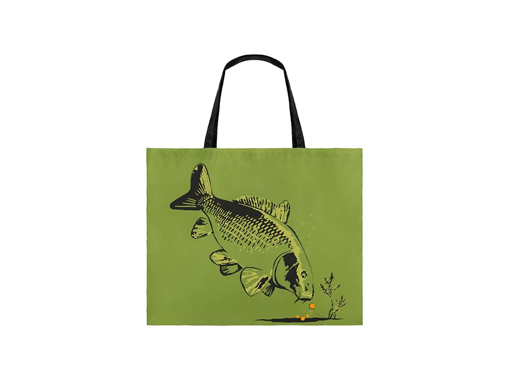Užitečná nákupní taška, potištěná jedinečným designem kapra nasávajícího kaprový návazec s nástrahou. Díky praktickým rozměrům v rozloženém ale i složeném stavu si najde široké uplatnění nejen u rybářů.Je vyhotovena z pevné a odolné tkaniny zelené barvy a doplněna delšími černými poutky na rameno nebo do ruky.