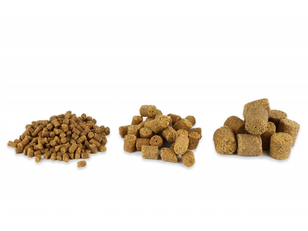 Pelety nabízíme ve 3 a 18 mm, kdy malé (3 mm) jsou vhodné do PVA punčoch a velké (18 mm) s dírkou jsou krom vnazení i skvělou nástrahou pro rychlý lov.