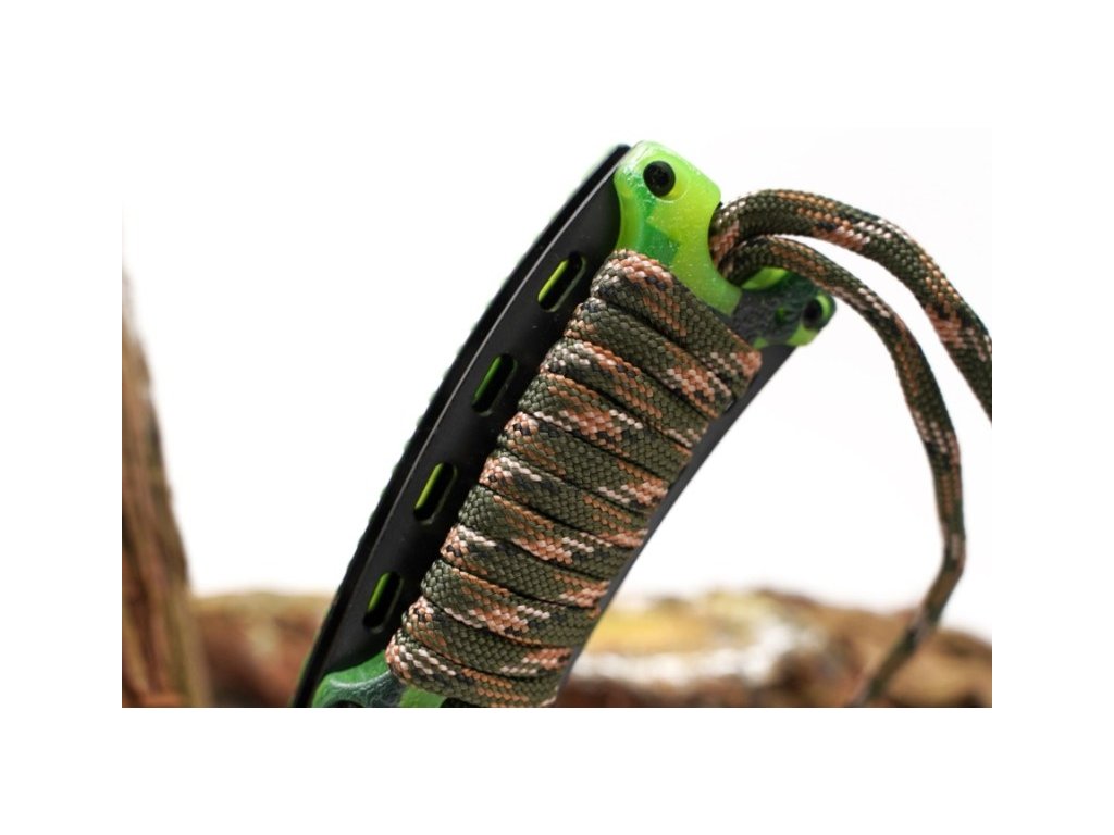 Rukojeť z ABS materiálu o délce 12 cm svítí ve tmě, takže nůž vždy snadno najdete, i při slabém osvětlení je obalena pevným paracordem, který nejenže poskytuje extra úchop a pohodlí,