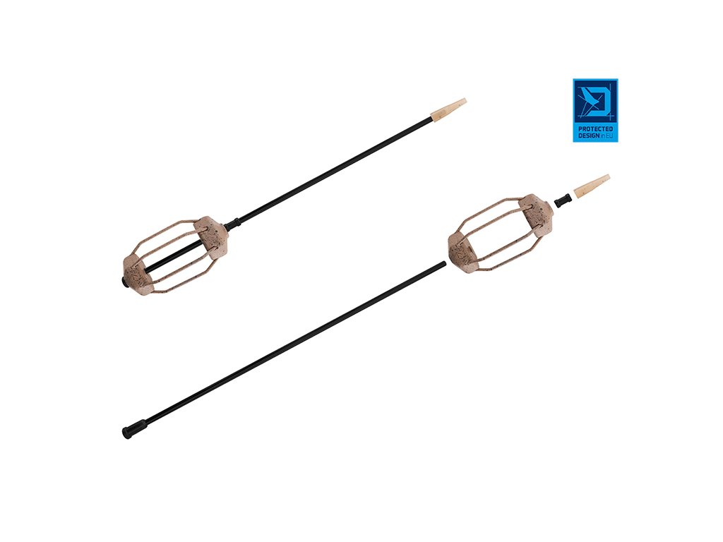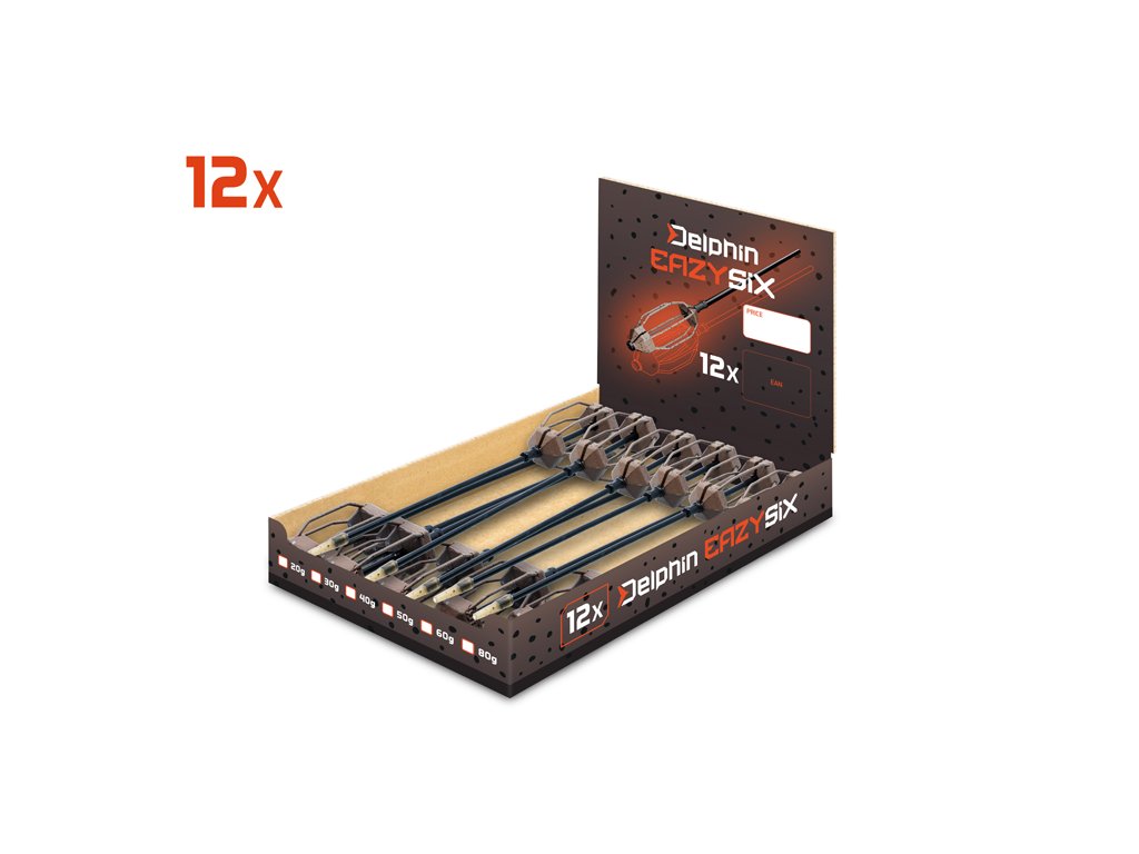 Delphin EazySix je určeno zejména pro rybáře, kteří mají v oblibě lov na položenou s krmítkem. Jeho aerodynamický tvar zaručuje spolehlivé a přesné doručení nástrahy a návnady na vaše lovné místo. Olověné tělo EazySix doplňuje 6 žeber, které dokonale udrží návnadu v krmítku při dopadu na dno. To však není všechno! EazySix disponuje hned několika dalšími vychytávkami, které nejsou standardem u krmítek z podobné kategorie. Jako první bychom zmínili odnímatelnou olověnou část s drážkou pro vlasec na trubičce, která je zajištěna gumovou bužírkou. Jednoduše stáhnete bužírku a bez zbytečného stříhání kmenového vlasce vyměníte olověnou zátěž za jinou, která vám v daných podmínkách vyhovuje. Trubička je kompatibilní s obratlíky vel. 4 z naší nabídky, které do ní dokonale zapadnou a zaručí, že vaše návnada bude poblíž nástrahy. Povrch EazySix je chráněn barvou v přírodních odstínech hnědé s černými frkanci. Tyto barvy dokonale kamuflují krmítko na dně i po rozpadnutí vnadící směsi. PROTECTED DESIGN - Tento produkt byl kompletně navržen designéry značky Delphin. Jeho design a technické řešení jsou natolik unikátní, že je registrován a chráněn na území celé Evropské unie.Doplňkové parametry