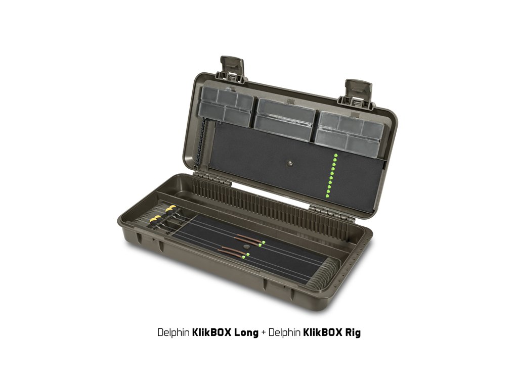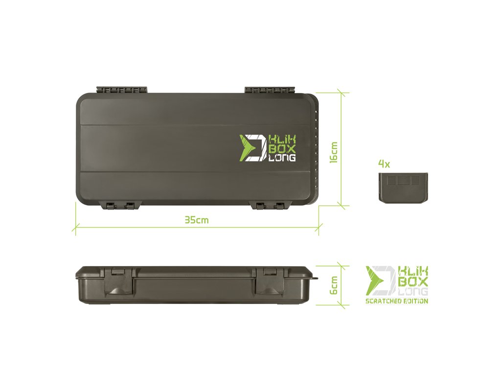 KlikBox Long je navíc vybaven platem z tvrzené pěny a špendlíky pro pohodlné uchycení koncových montáží. Podél celého odkládacího prostoru na návazce naleznete měřítko, podle kterého si budete umět přesně určit délku vašich koncových montáží. Organizér je vyroben z velmi odolného plastu a k jeho komfortnímu otevírání a uzavírání poslouží dva pevné plastové klipy.