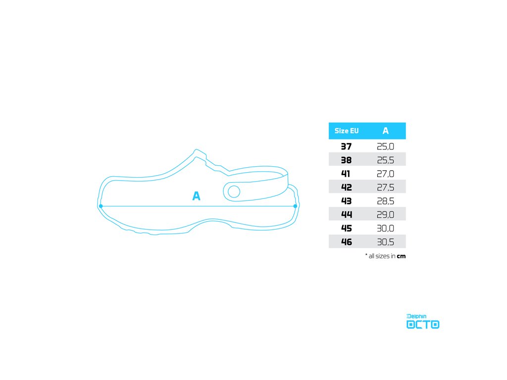 Od počátku vývoje tohoto produktu bylo naším záměrem přinést designově jedinečné vsuvky, které budou splňovat požadavky rybářů na maximální funkčnost a komfort během nošení nejen na rybách, ale i v běžném životě. A výsledek? Delphin OCTO - ultra lehké pantofle z EVA pěny, inspirované přírodou, kompletně navrženy a vyráběny v Evropské unii! Vzhledem k tomu, že během rybolovu je nutné často chodit po nerovném terénu, jsme se při vývoji zaměřili na podešev, která je podstatně pevnější a masivnější ve srovnání s levnějšími konkurenčními modely. Právě to zaručuje, že chození v těchto vsuvkách bude maximálně komfortní a dokonale odfiltruje nerovnosti terénu. Při podešvi ještě chvíli zůstaneme. Právě tam začíná příběh názvu OCTO. Stylizovali jsme ji totiž do tvaru přísavek chapadel chobotnice, což zaručuje výborný grip za každých podmínek. Právě chobotnice, anglicky OCTOpus, anebo latinsky OCTOpod byly inspirací pro kompletní design a název ve zkrácené forme - OCTO. Dalším sofistikovaným prvkem jsou velké postranní otvory, jejichž prioritním úkolem je starat se o odvětrávání a celkovou vzdušnost v této obuvi. Záměrně nejsou navrženy ve výši podrážky, jak to bývá standardem, ale o něco výše. Právě tento detail hraje významnou roli během pobytu na břehu, či mělké vodě. Tím, že otvory jsou o něco vyšší nad vnitřní stélkou je téměř eliminováno nechtěné nabírání písku či kamínků mezi podrážku a chodilo. Vaše chodidla jsou tedy chráněny v maximální možné míře. Kromě těchto otvorů slouží k odvětrávání hustá perforace umístěna ve vrchní části. Ta je záměrně vytvarována na jedné straně do symbolu D z loga Delphin, na druhé vsuvce zase kraluje symbol O, jako počáteční písmeno názvu OCTO. Celkový dojem ještě zhodnocuje jemná struktura na povrchu pantoflí, která evokuje kůži chobotnice. Díky použitému EVA materiálu jsou mimořádně lehké, houževnaté a dokonce plovoucí. Samozřejmostí je u tohoto modelu poutko na fixaci paty (lidově nazývané i uzávěrka), které oceníte zejména v nerovné, či svahovitejšom terénu. Delphin OCTO jsou jednoduše stylovou letní obuví, jedinečného designu, s velmi širokým využitím. Ať už potřebujete přezůvky do interiéru, jít na ryby, vykoupat se, neboli do města. OCTO jsou tu aby vás převedli všemi nástrahami dne komfortně a s lehkostí. Jediným mínusem je, že nejsou vhodné pro vysokohorskou turistiku, to však díky ostatní všestrannosti určitě oželíte :) Jelikož jsou pantofle vyrobeny z EVA materiálu, vedle množství výhod třeba dbát i na péči o tento materiál. Nenechávejte ho proto vystaven dlouhodobě přímému prudkému slunečnímu záření na rozpálených kamenech či betonu. Právě tam může teplota atakovat až 50 stupňů Celsia, což může způsobit jemné tvarové deformace. Samozřejmě, pokud jsou pantofle na nohách, k takovému jevu nedochází a životnost se počítá na roky.Doplňkové parametry