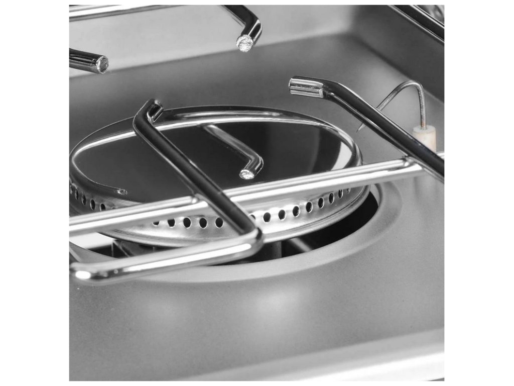 - Dva hořáky: Horní část tvoří robustní dvouplotýnkový vařič s individuální regulací pro rychlé smažení, vaření i ohřívání.